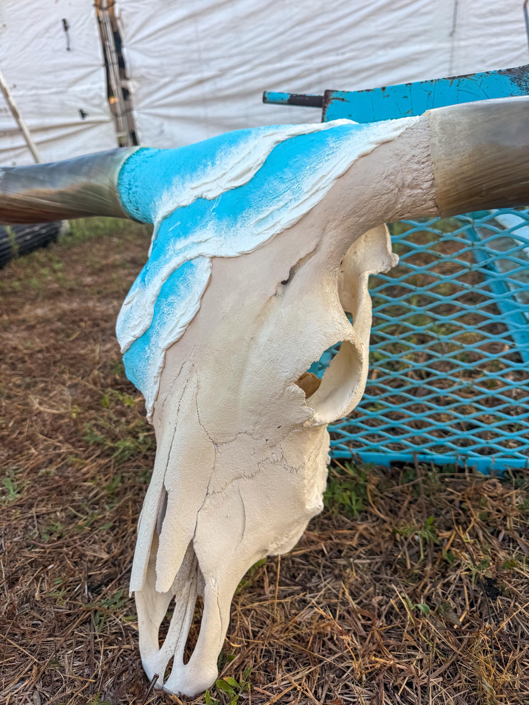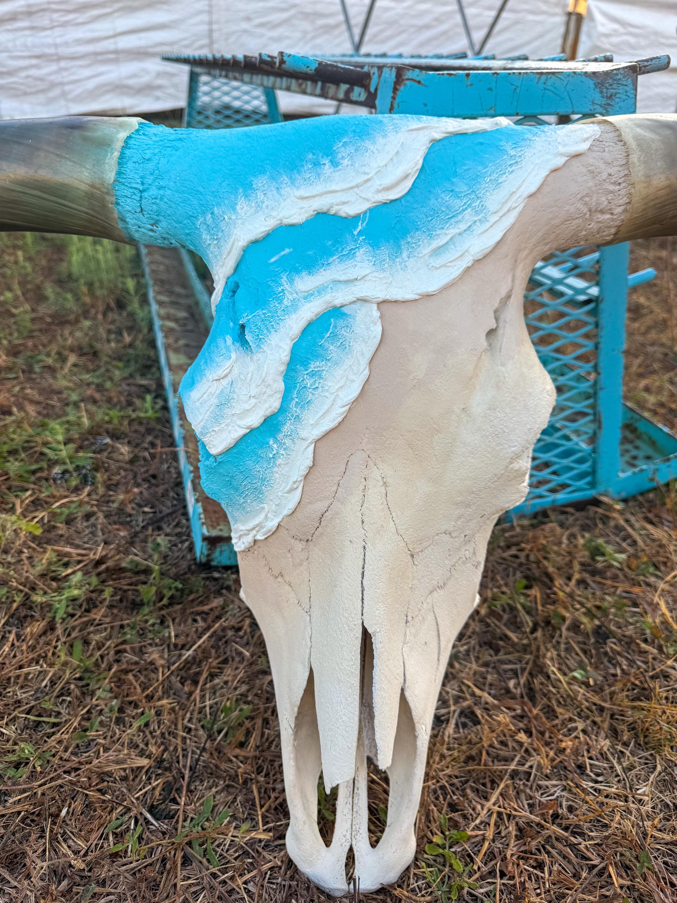 Artist Mikyla's biggest inspiration for this art piece is the Pacific Ocean where she frequently captures amazing photographs. Once roaming the vast plains, Ocean Serene the longhorn cow carried the spirit of the wild west within her. Now, adorned with stunning art inspired by the Pacific's tranquil waves, her skull embodies a harmonious blend of rugged strength and coastal serenity. This unique piece brings the essence of both untamed land and peaceful shores to any modern farmhouse or western modern decor. This masterpiece will come with a 8 x 10 original photograph by Artist Mikyla as a bonus!