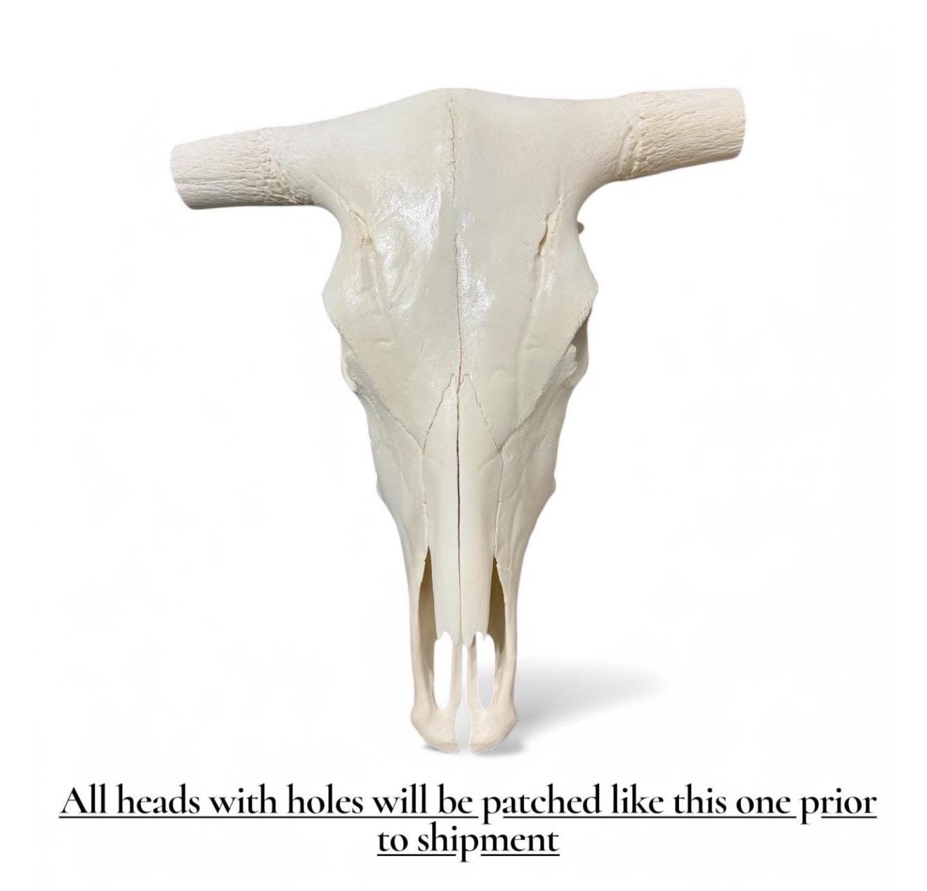 These are dairy cow skulls fitted with molded longhorn cores, designed to deceive buyers into thinking they are genuine longhorns. The attached ox horns often break over time. You can usually spot these fakes because the skull's structure appears unnatural or strange. A real longhorn skull has natural horn cores and doesn’t require any bondo or artificial work like dairy cow skulls who was not born with horns.