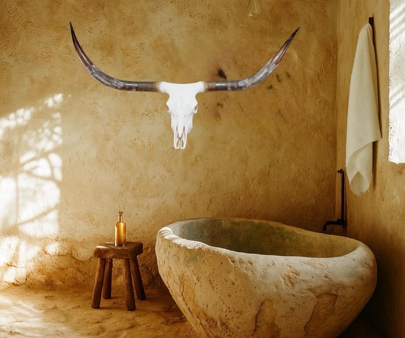 PLEASE NOTE: Our thoughtfully curated home decor backgrounds are designed to help you envision how a longhorn skull will elevate your space, offering inspiration for your walls. To make your decision effortless, we provide detailed videos and precise dimensions so you can see exactly how the piece will fit in your home. The total horn measurement is included so you can fully visualize the true size of a longhorn skull. Through our years of experience crafting longhorn skulls, we’ve found that some may appear shorter in width but look much larger due to the total curvature of the horns. This is why including the total horn measurement is so important.