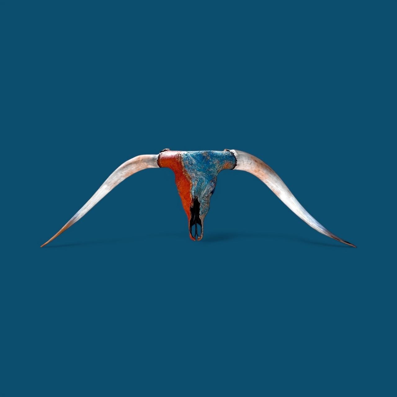The Forged Horizon takes the raw power of Texas longhorn tradition and fuses it with heavily textured metallic artistry. The skull is layered with deep rust reds and stormy blues, creating a one-of-a-kind surface that looks as if it was forged in fire and weathered by time. Every ridge and brushstroke carries a rugged, tactile feel, bold texture you can see and touch.
