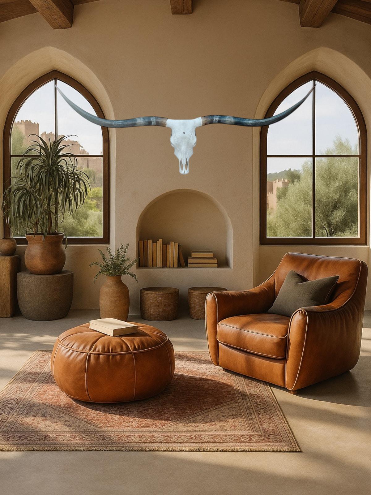 PLEASE NOTE: Our thoughtfully curated home decor backgrounds are designed to help you envision how a longhorn skull will elevate your space, offering inspiration for your walls. To make your decision effortless, we provide detailed videos and precise dimensions so you can see exactly how the piece will fit in your home. The total horn measurement is included so you can fully visualize the true size of a longhorn skull. Through our years of experience crafting longhorn skulls, we’ve found that some may appear shorter in width but look much larger due to the total curvature of the horns. This is why including the total horn measurement is so important.
