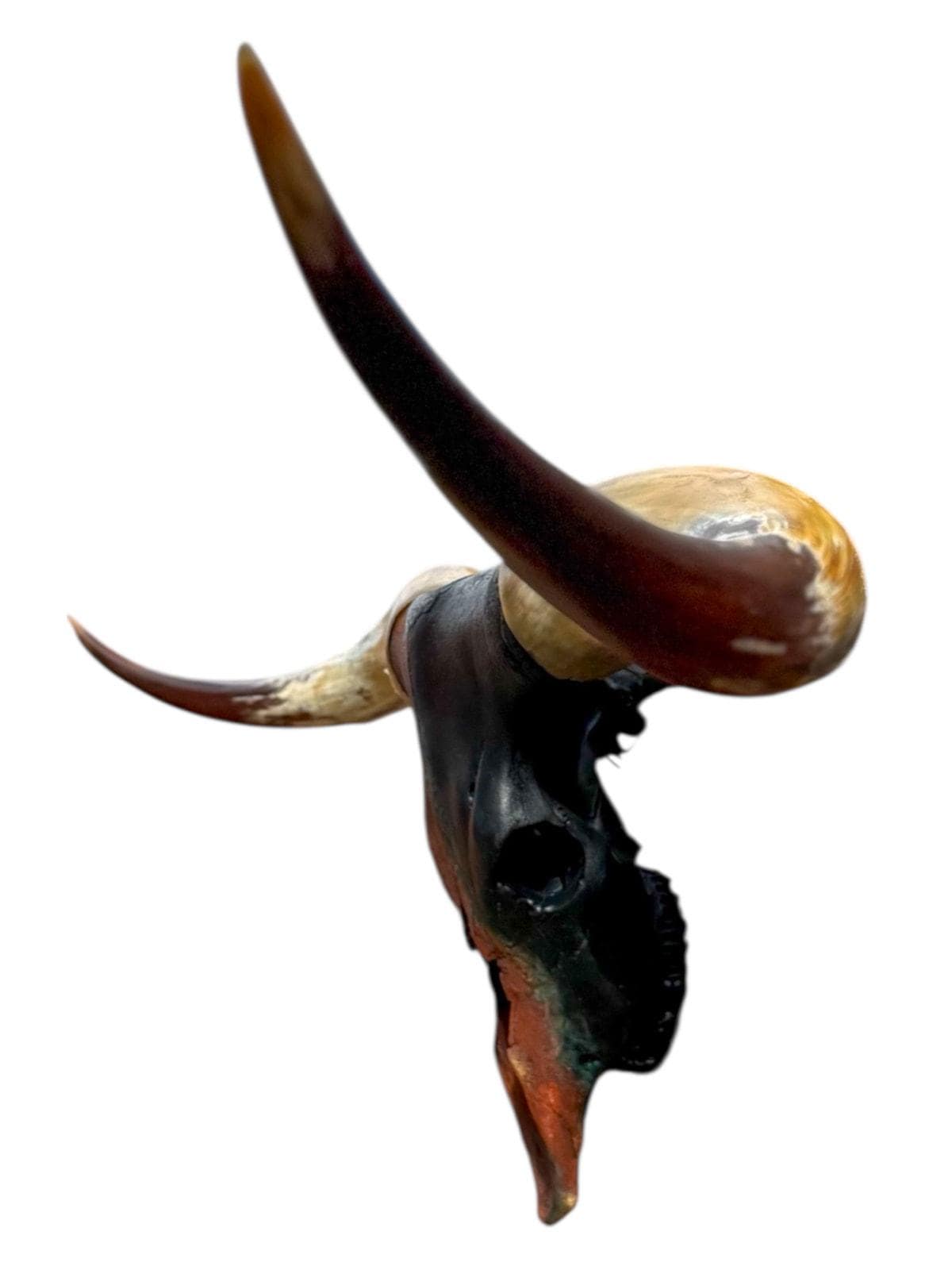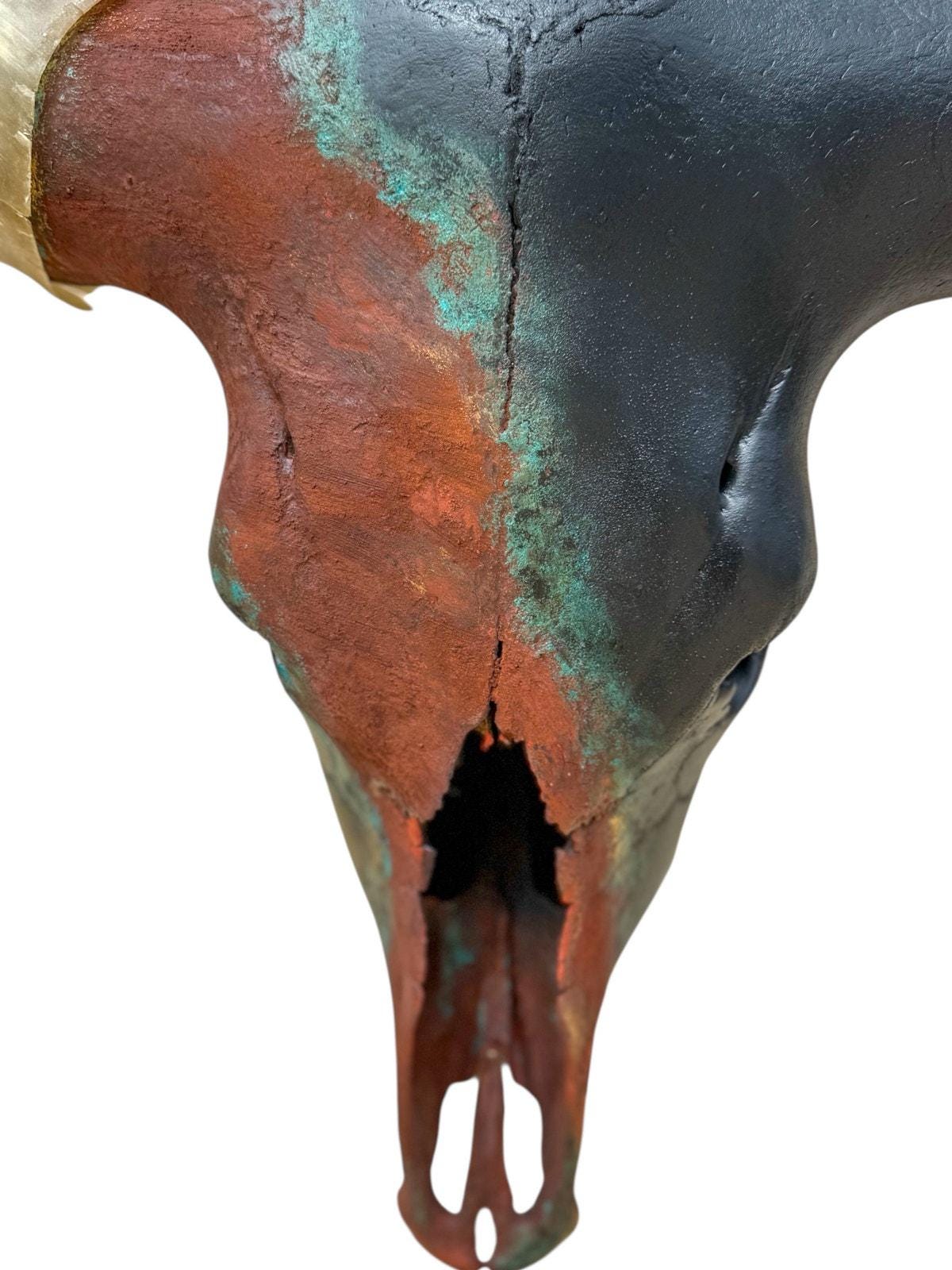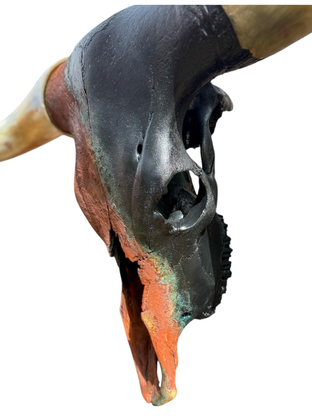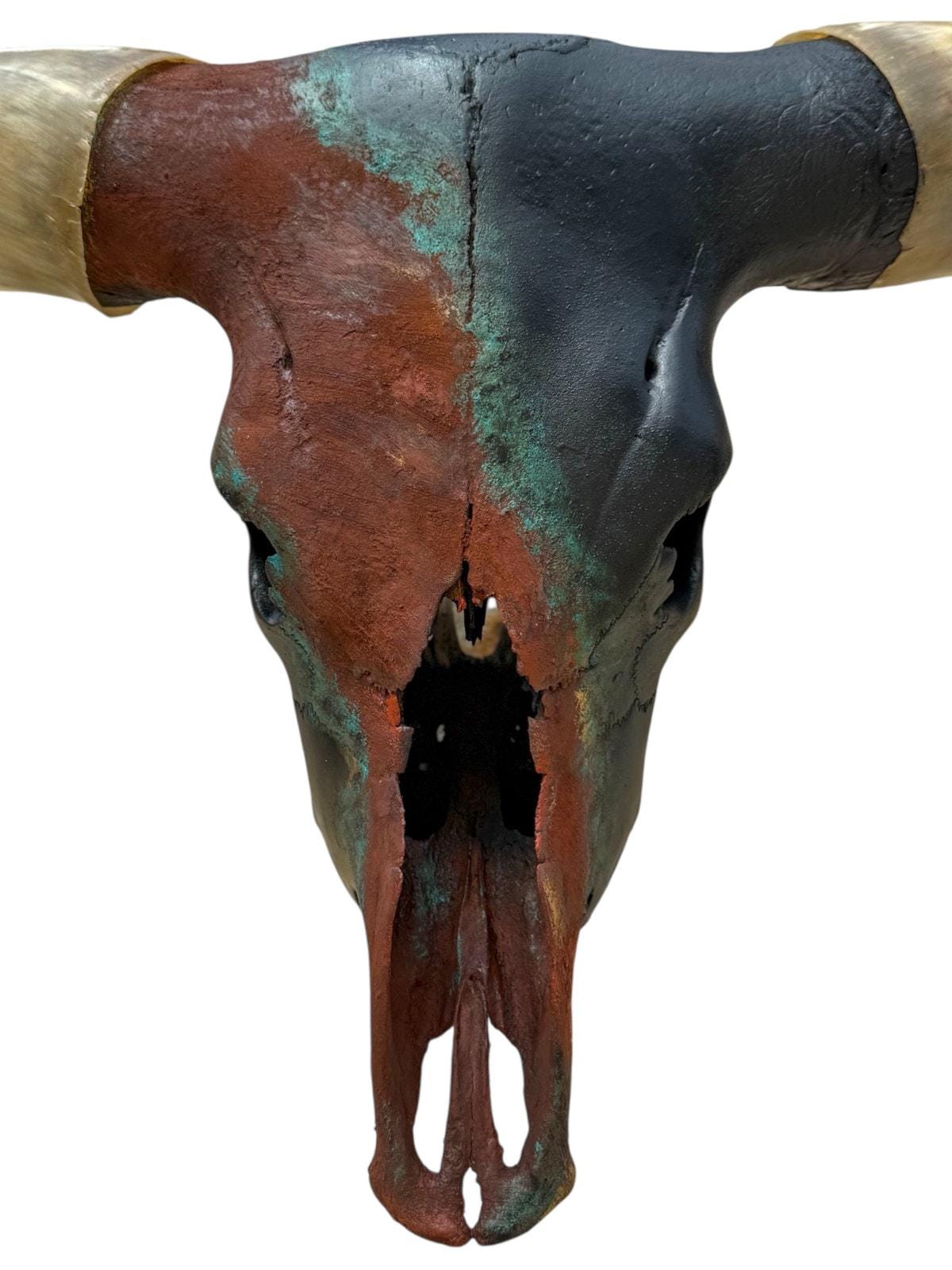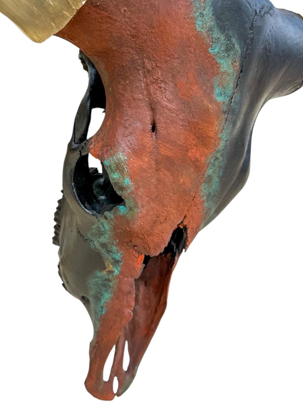 Saxon is a longhorn skull that looks less like décor and more like an artifact of conquest. Its face is armored in black, scarred with iron-red tones, and veined with green patina as if it weathered centuries of fire and earth. The horns sweep wide and unrelenting, a natural crown that refuses subtlety.
