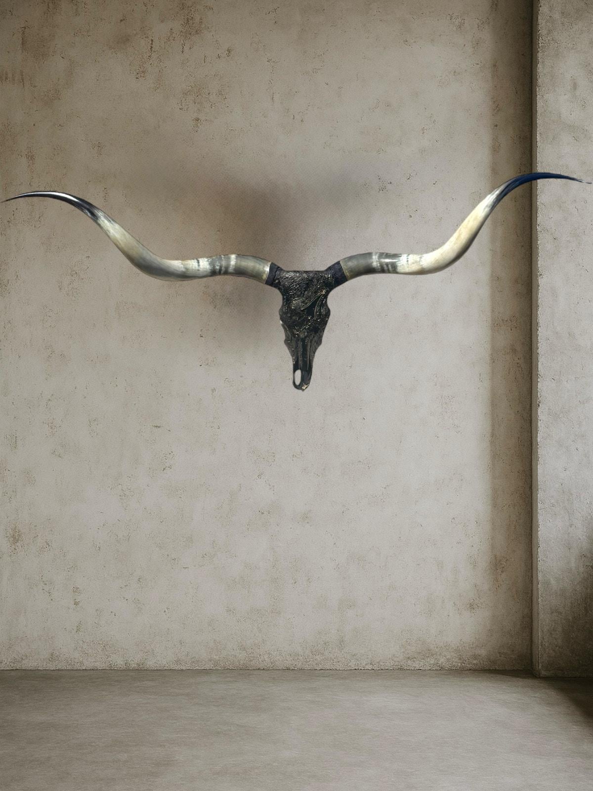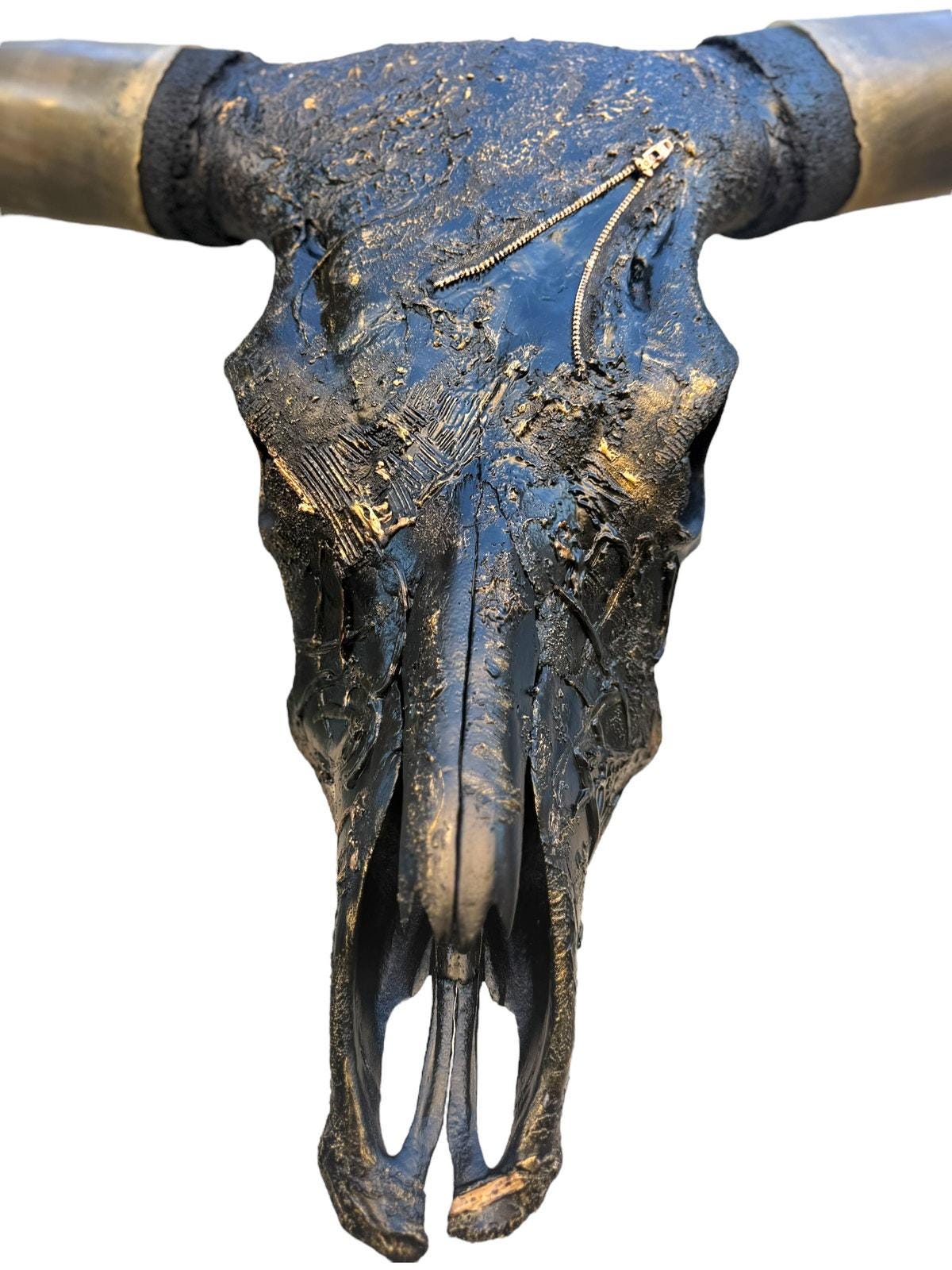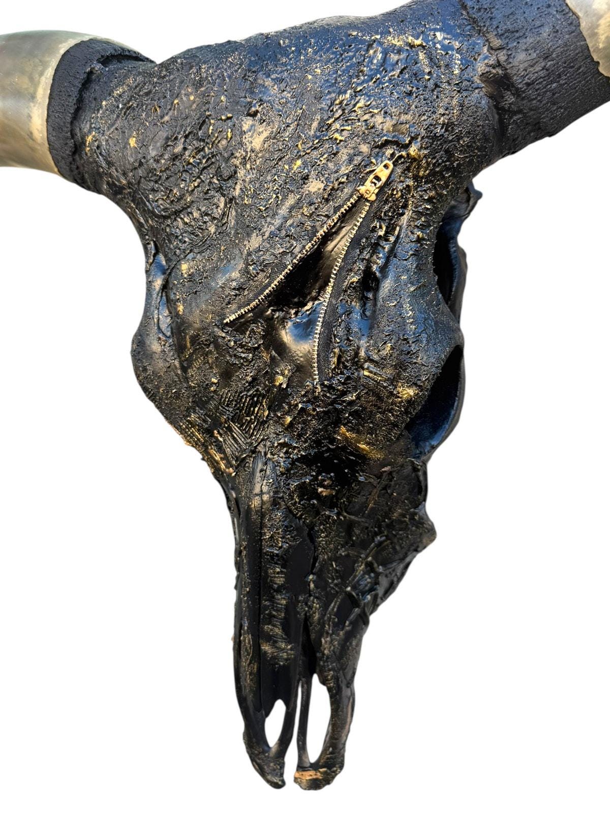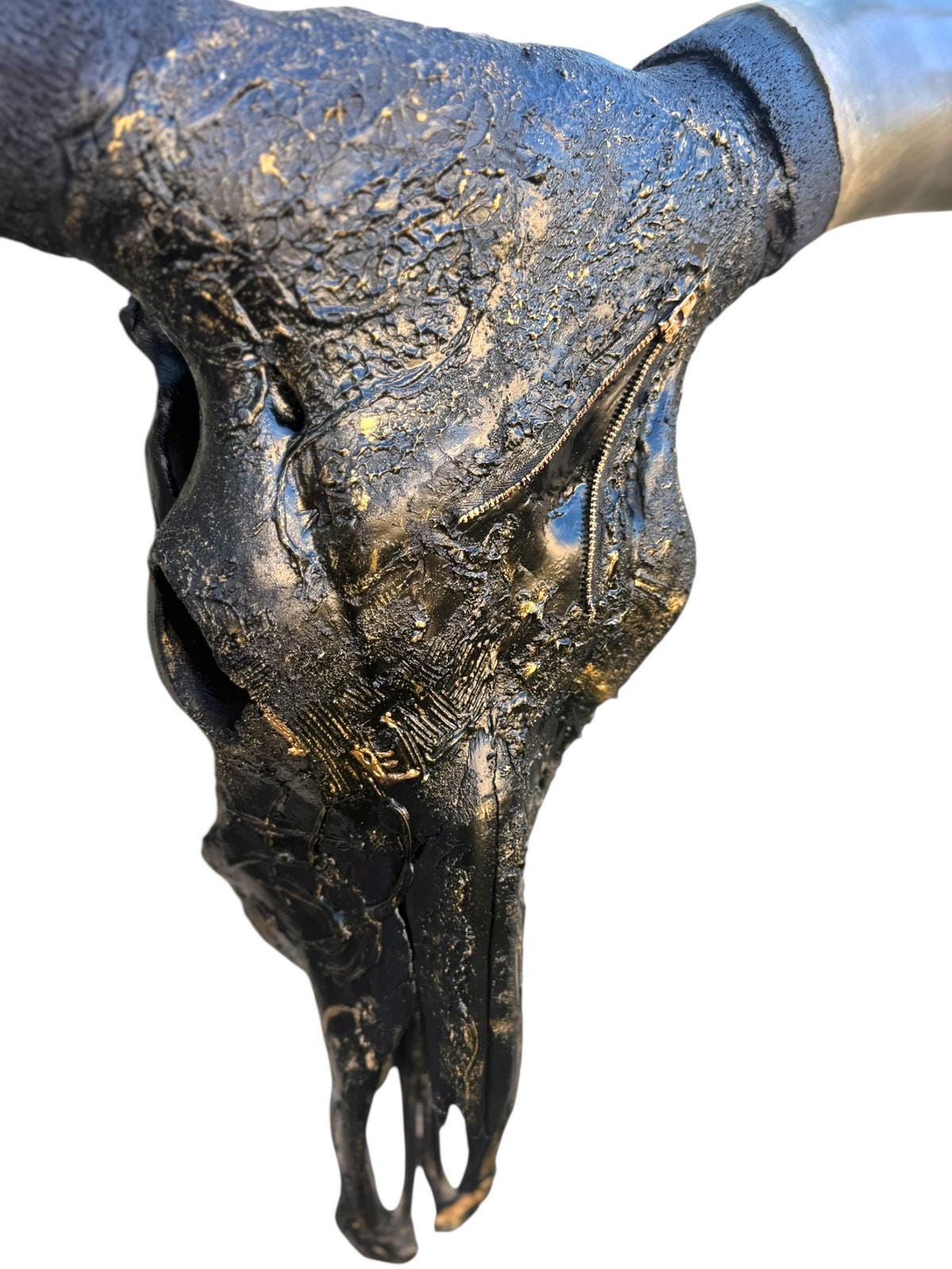 This is not just a longhorn skull. It’s a commanding statement, forged at the crossroads of tradition and avant-garde design. The blackened textures, alive with veins of gold, shimmer with the kind of depth that feels both ancient and impossibly modern. Its sweeping horns span like a horizon, anchoring the piece in power and permanence.
