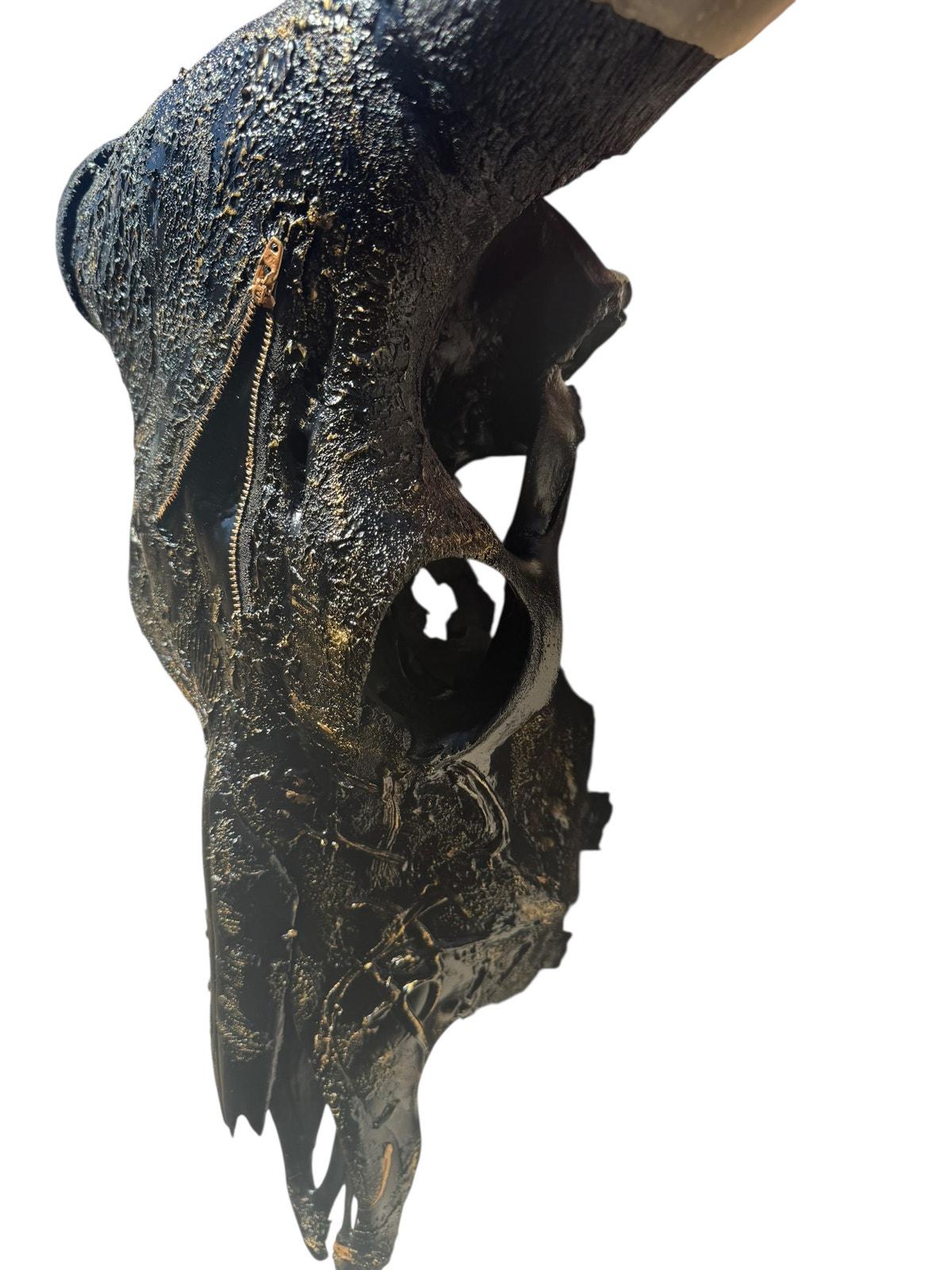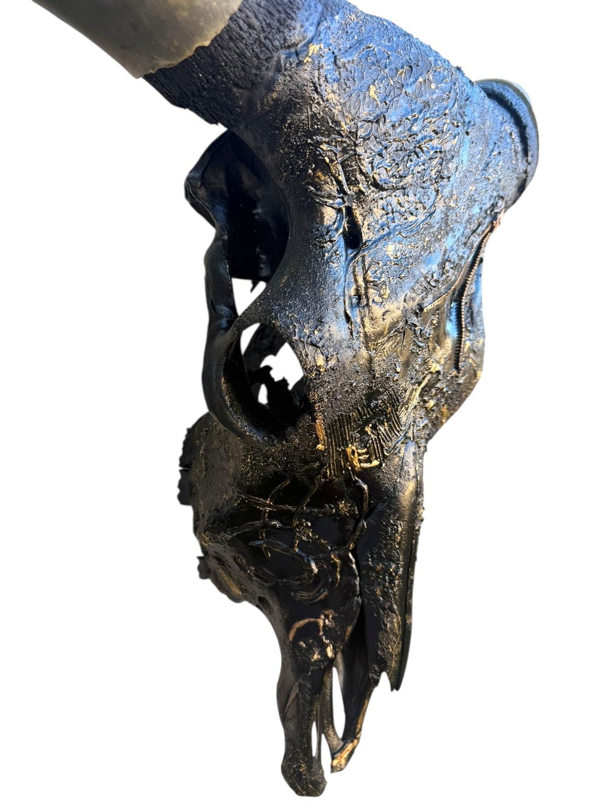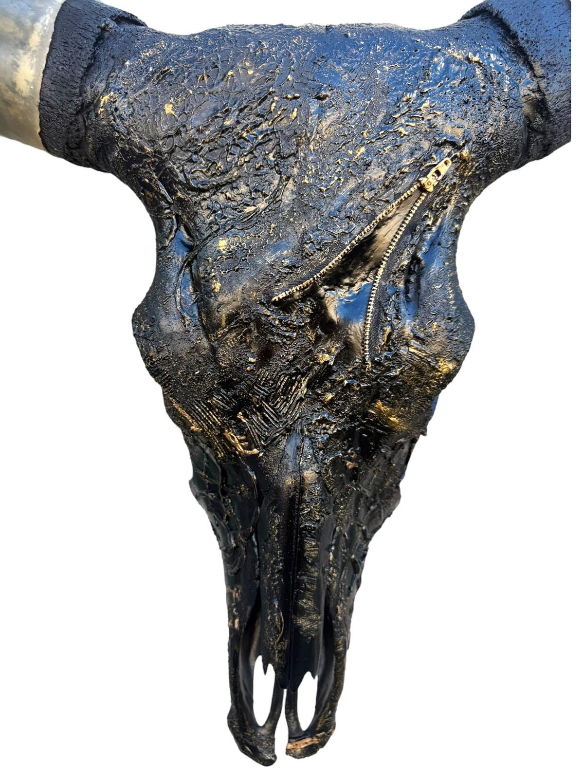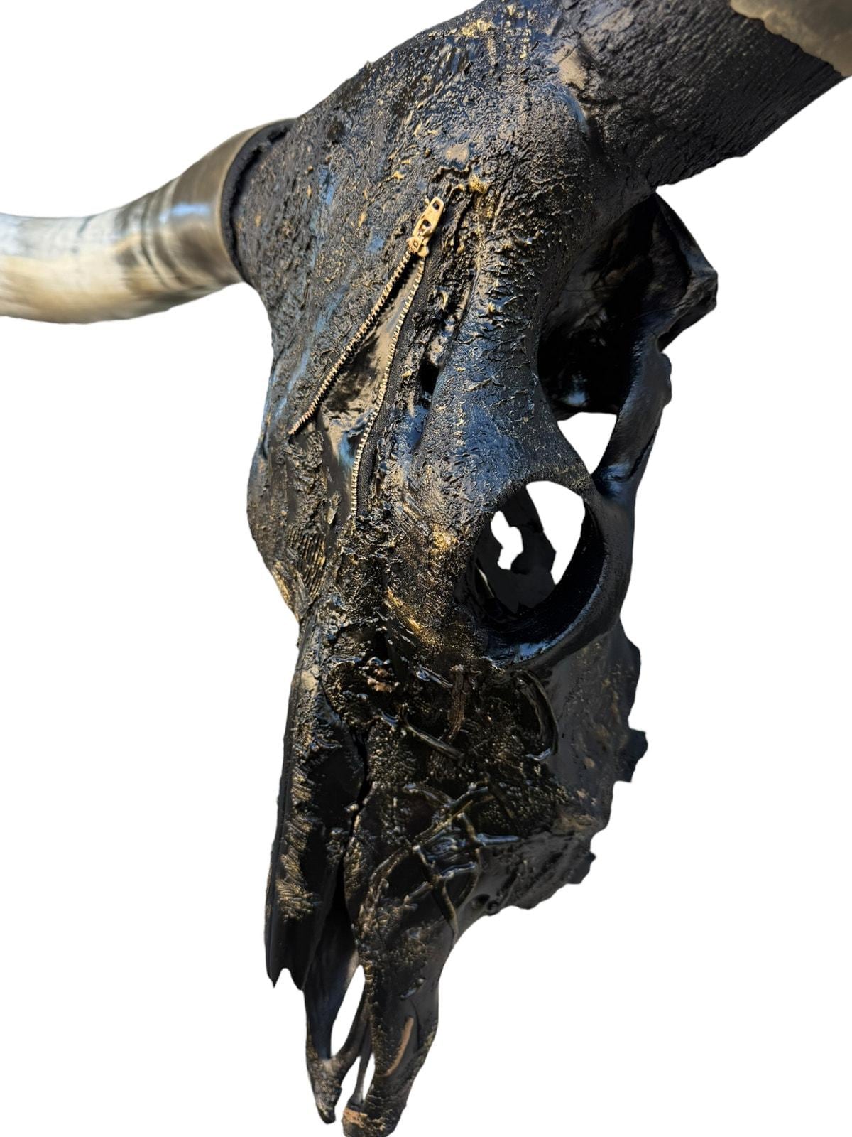 This is not just a longhorn skull. It’s a commanding statement, forged at the crossroads of tradition and avant-garde design. The blackened textures, alive with veins of gold, shimmer with the kind of depth that feels both ancient and impossibly modern. Its sweeping horns span like a horizon, anchoring the piece in power and permanence.