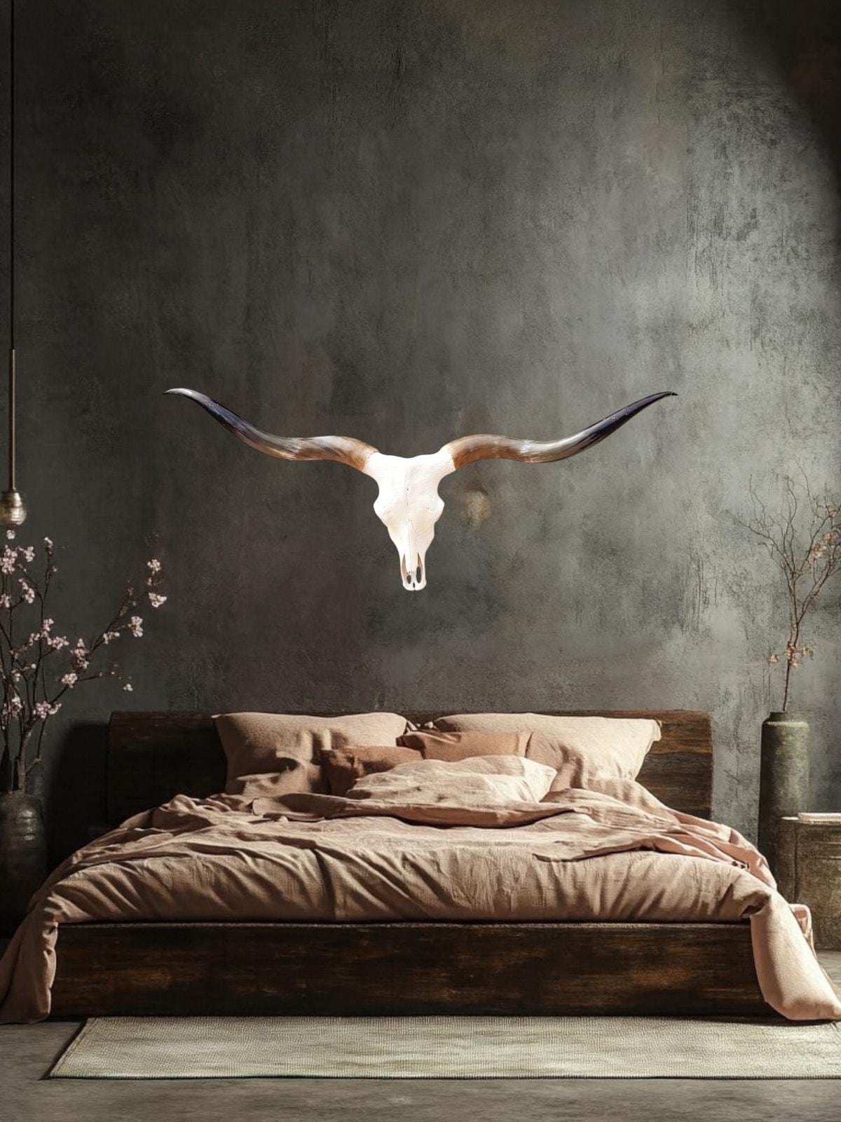 PLEASE NOTE: Our thoughtfully curated home decor backgrounds are designed to help you envision how a longhorn skull will elevate your space, offering inspiration for your walls. To make your decision effortless, we provide detailed videos and precise dimensions so you can see exactly how the piece will fit in your home. The total horn measurement is included so you can fully visualize the true size of a longhorn skull. Through our years of experience crafting longhorn skulls, we’ve found that some may appear shorter in width but look much larger due to the total curvature of the horns. This is why including the total horn measurement is so important.