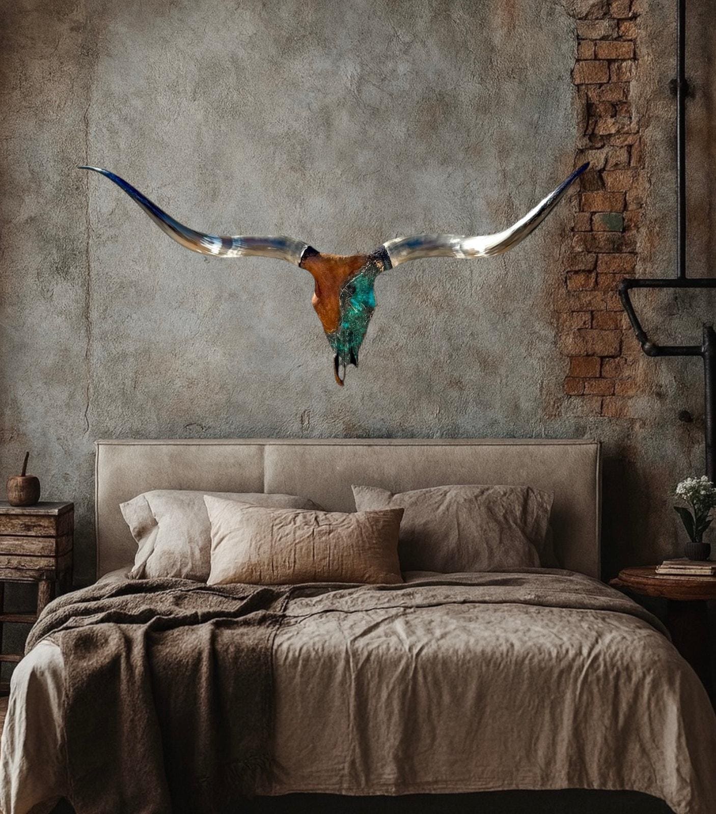 PLEASE NOTE: Our thoughtfully curated home decor backgrounds are designed to help you envision how a longhorn skull will elevate your space, offering inspiration for your walls. To make your decision effortless, we provide detailed videos and precise dimensions so you can see exactly how the piece will fit in your home. The total horn measurement is included so you can fully visualize the true size of a longhorn skull. Through our years of experience crafting longhorn skulls, we’ve found that some may appear shorter in width but look much larger due to the total curvature of the horns. This is why including the total horn measurement is so important.