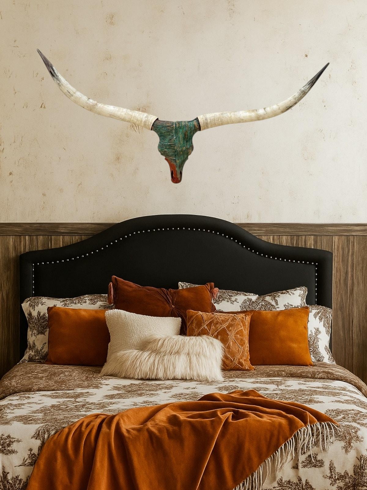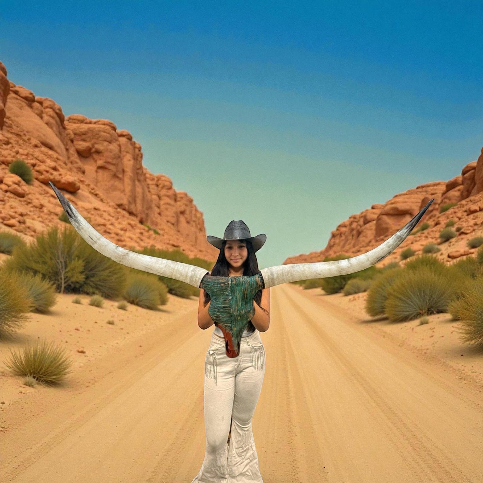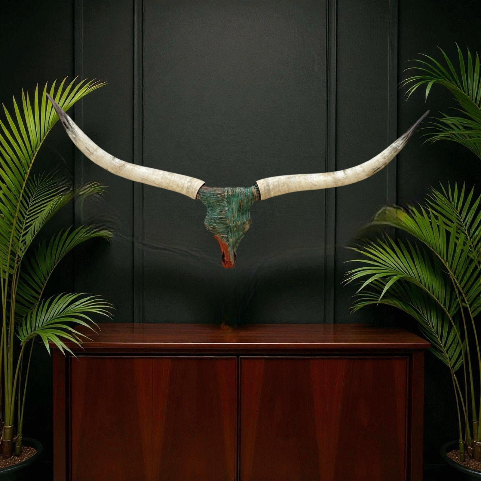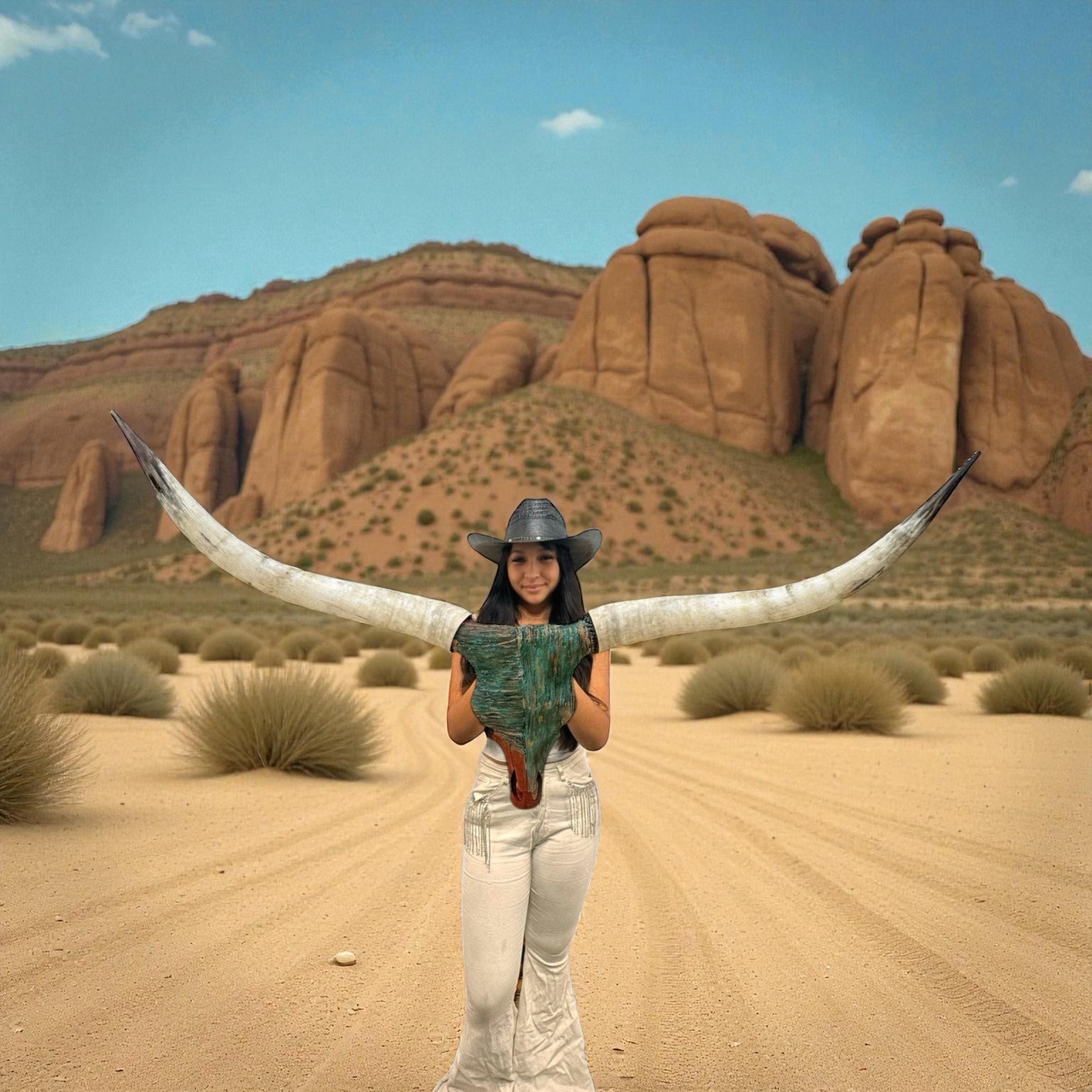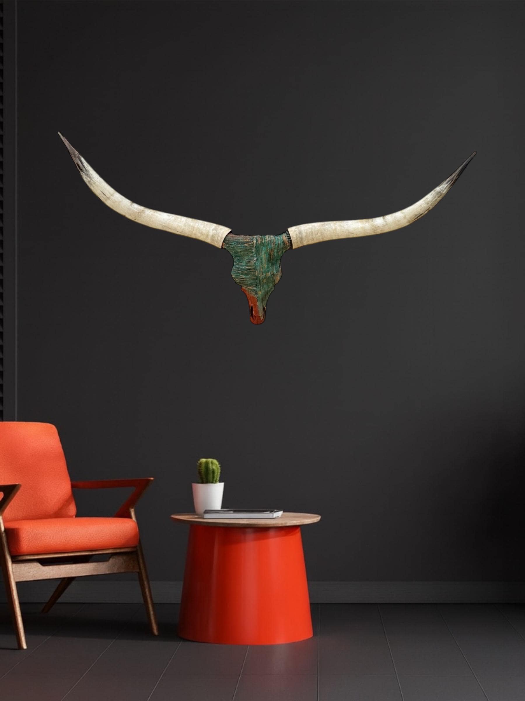 PLEASE NOTE: Our thoughtfully curated home decor backgrounds are designed to help you envision how a longhorn skull will elevate your space, offering inspiration for your walls. To make your decision effortless, we provide detailed videos and precise dimensions so you can see exactly how the piece will fit in your home. The total horn measurement is included so you can fully visualize the true size of a longhorn skull. Through our years of experience crafting longhorn skulls, we’ve found that some may appear shorter in width but look much larger due to the total curvature of the horns. This is why including the total horn measurement is so important.
