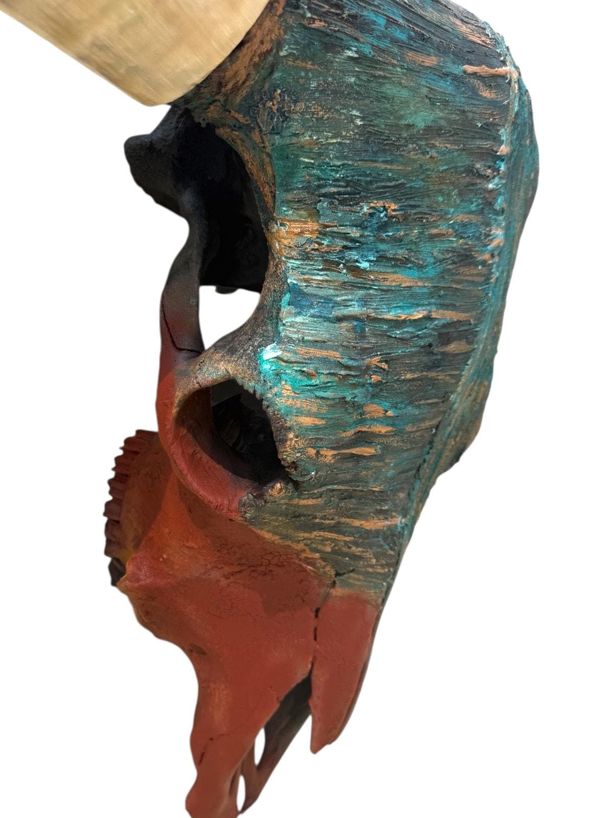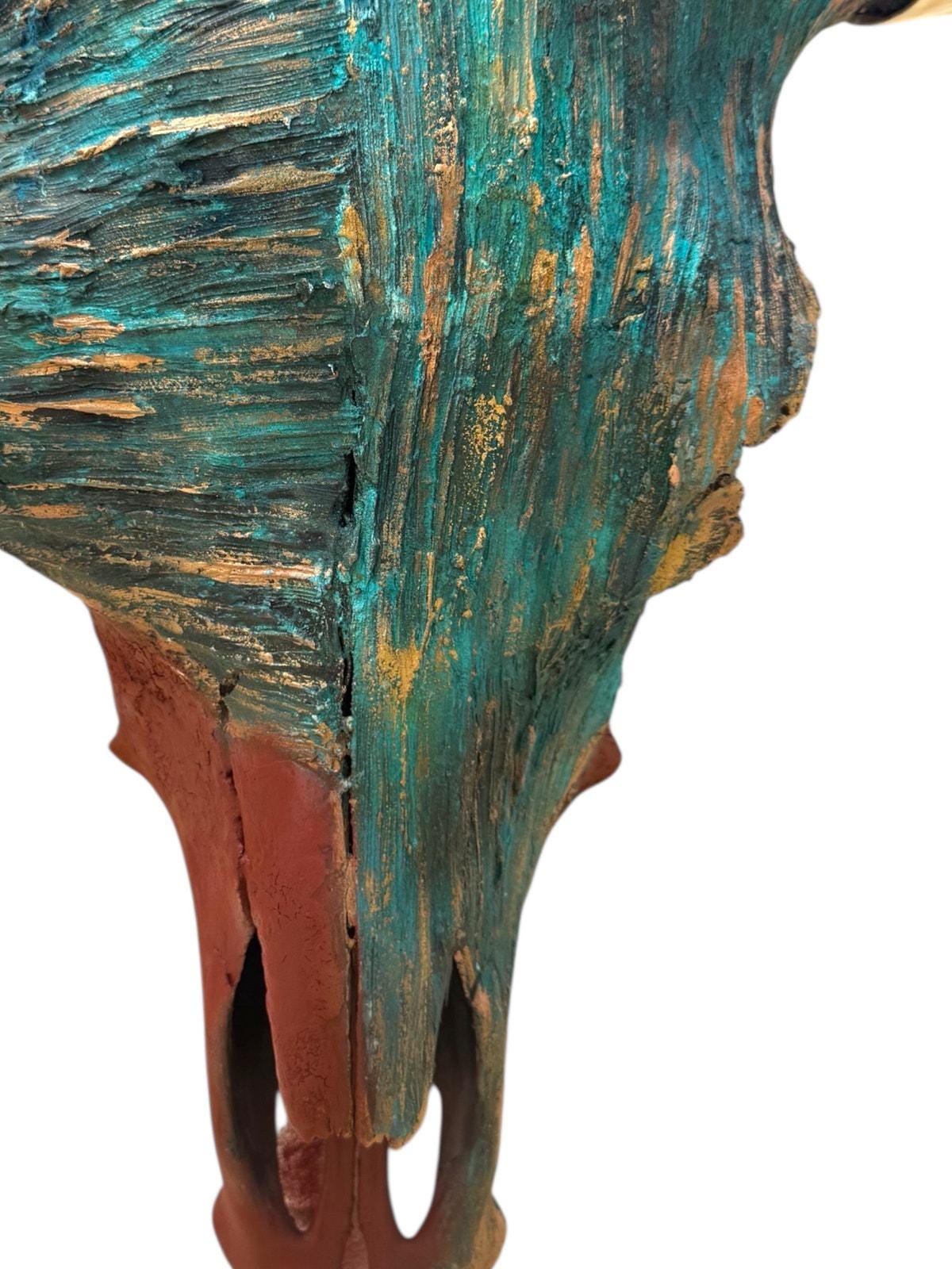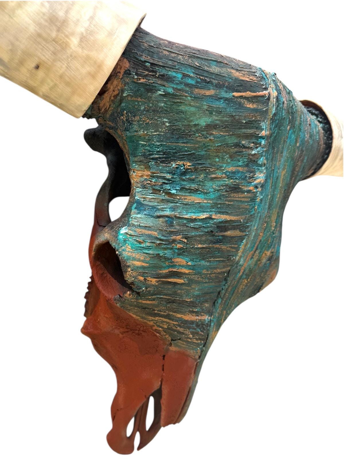 The Keitaro Boone carries the quiet strength of something that’s lived through seasons most of us will never see. The turquoise patina, warm copper tones, and deep earth reds weren’t just brushed on, they were slowly built layer by layer, giving the skull a look that feels aged by wind, sun, and time. Every groove and fracture holds a softness to it, like the worn pages of a story passed down through generations.