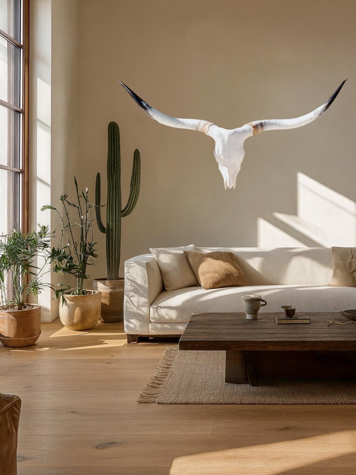 PLEASE NOTE: Our thoughtfully curated home decor backgrounds are designed to help you envision how a longhorn skull will elevate your space, offering inspiration for your walls. To make your decision effortless, we provide detailed videos and precise dimensions so you can see exactly how the piece will fit in your home. The total horn measurement is included so you can fully visualize the true size of a longhorn skull. Through our years of experience crafting longhorn skulls, we’ve found that some may appear shorter in width but look much larger due to the total curvature of the horns. This is why including the total horn measurement is so important.