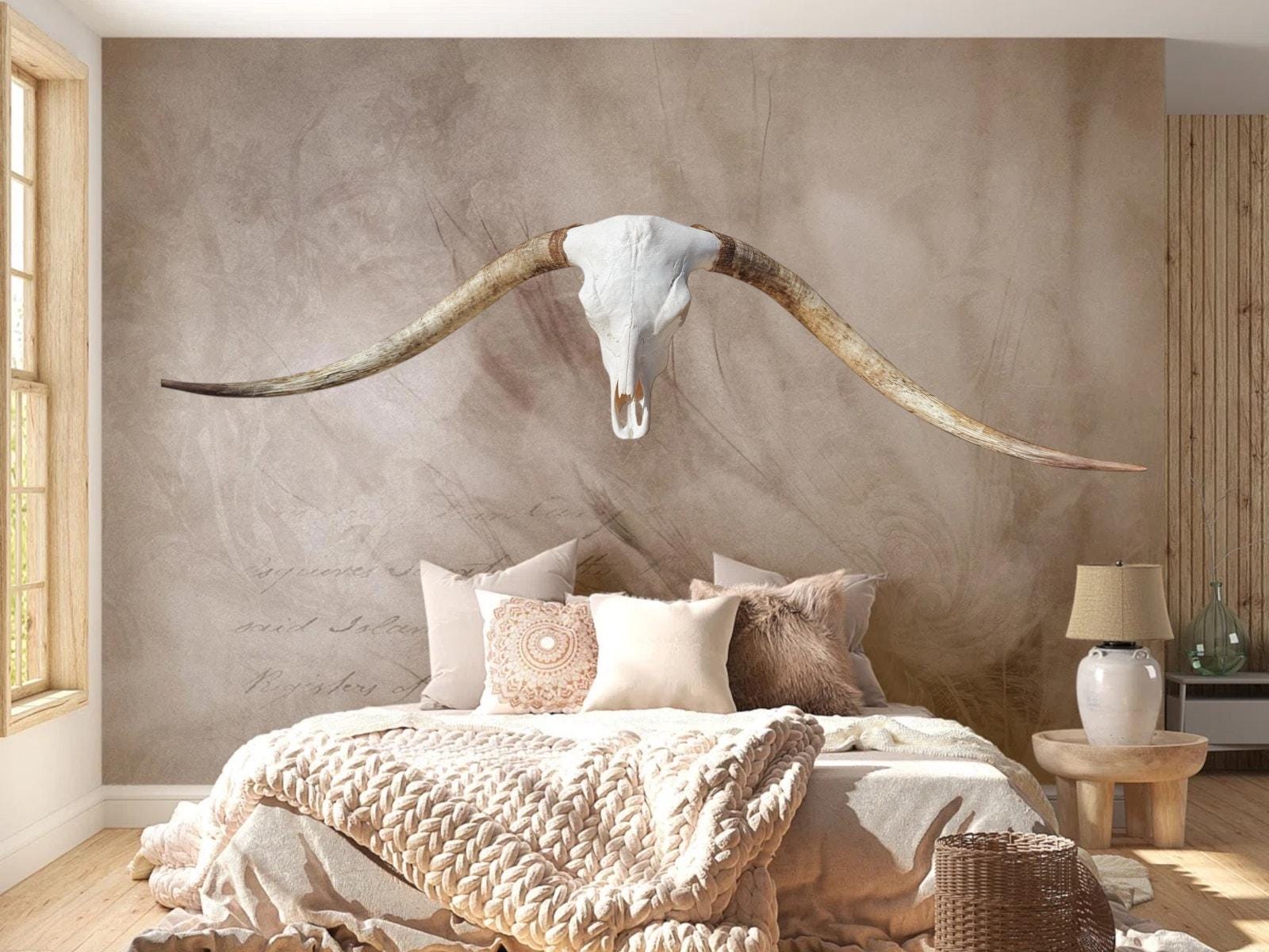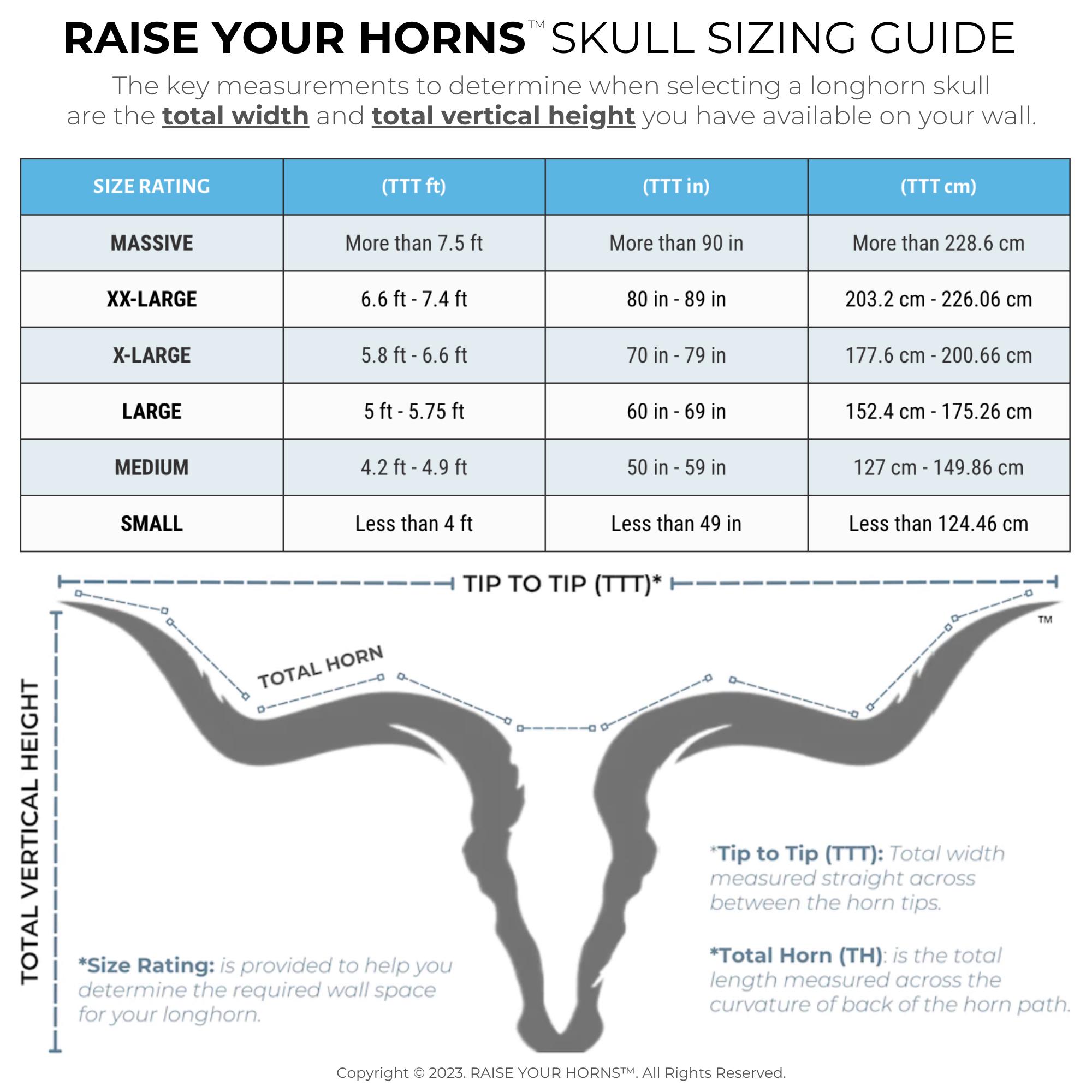 PLEASE NOTE: Our thoughtfully curated home decor backgrounds are designed to help you envision how a longhorn skull will elevate your space, offering inspiration for your walls. To make your decision effortless, we provide detailed videos and precise dimensions so you can see exactly how the piece will fit in your home. The total horn measurement is included so you can fully visualize the true size of a longhorn skull. Through our years of experience crafting longhorn skulls, we’ve found that some may appear shorter in width but look much larger due to the total curvature of the horns. This is why including the total horn measurement is so important.