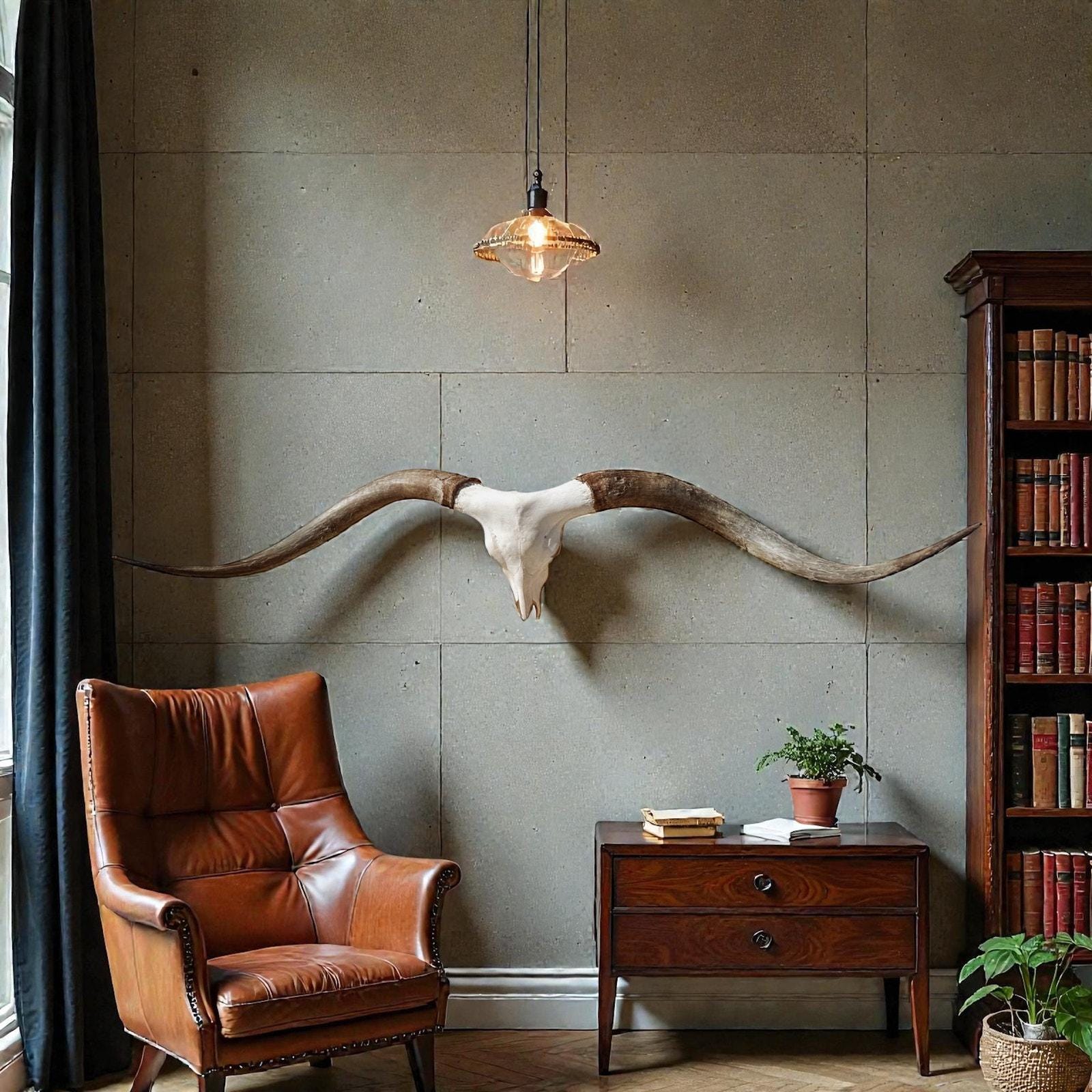 PLEASE NOTE: Our thoughtfully curated home decor backgrounds are designed to help you envision how a longhorn skull will elevate your space, offering inspiration for your walls. To make your decision effortless, we provide detailed videos and precise dimensions so you can see exactly how the piece will fit in your home. The total horn measurement is included so you can fully visualize the true size of a longhorn skull. Through our years of experience crafting longhorn skulls, we’ve found that some may appear shorter in width but look much larger due to the total curvature of the horns. This is why including the total horn measurement is so important.