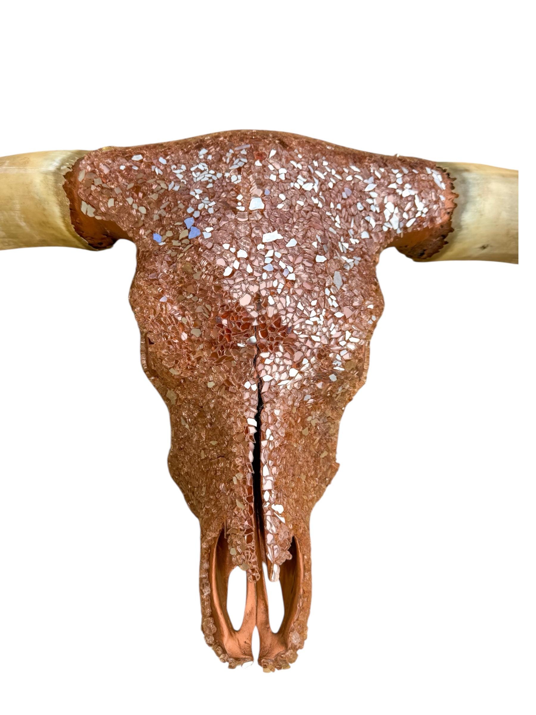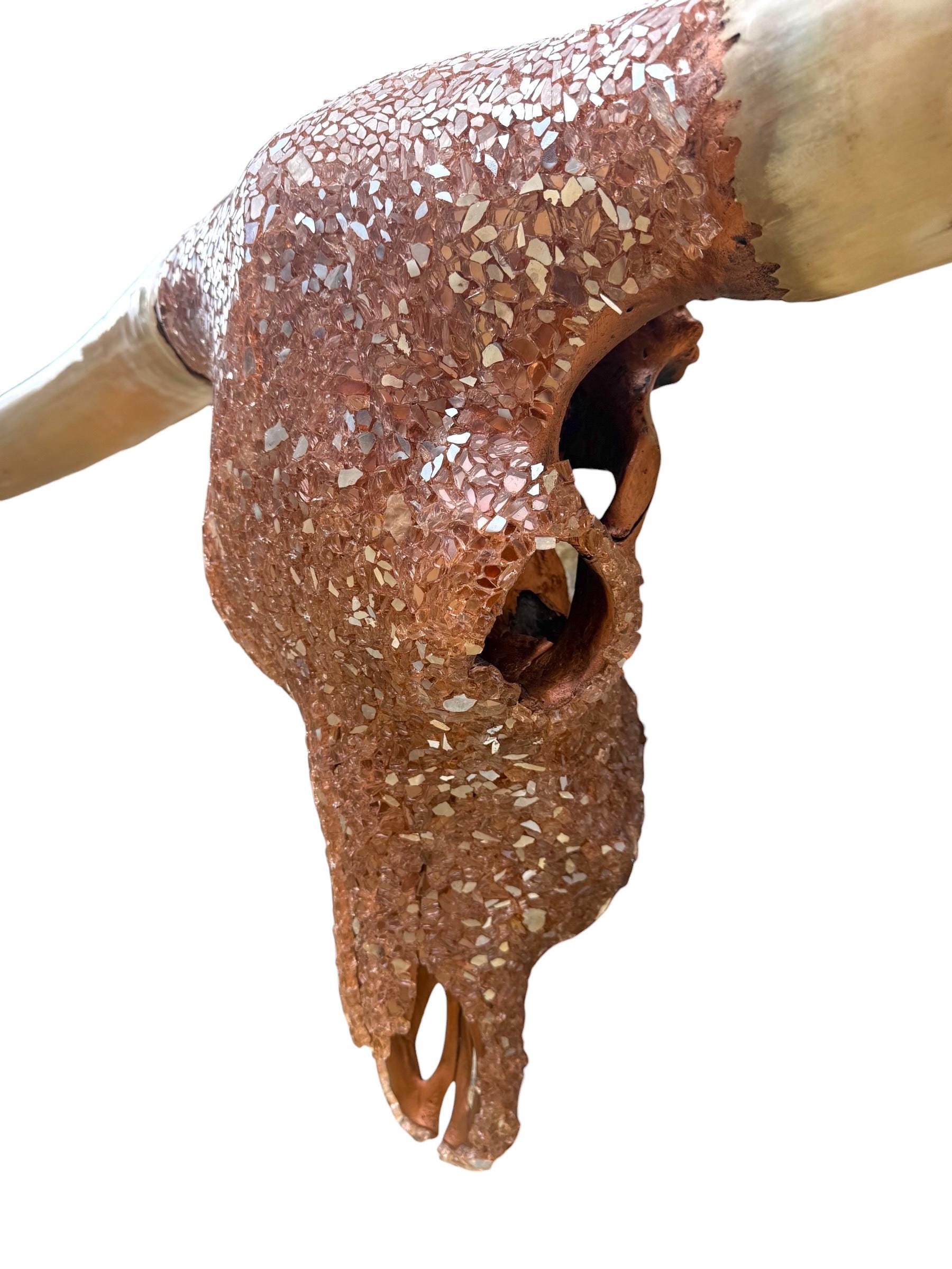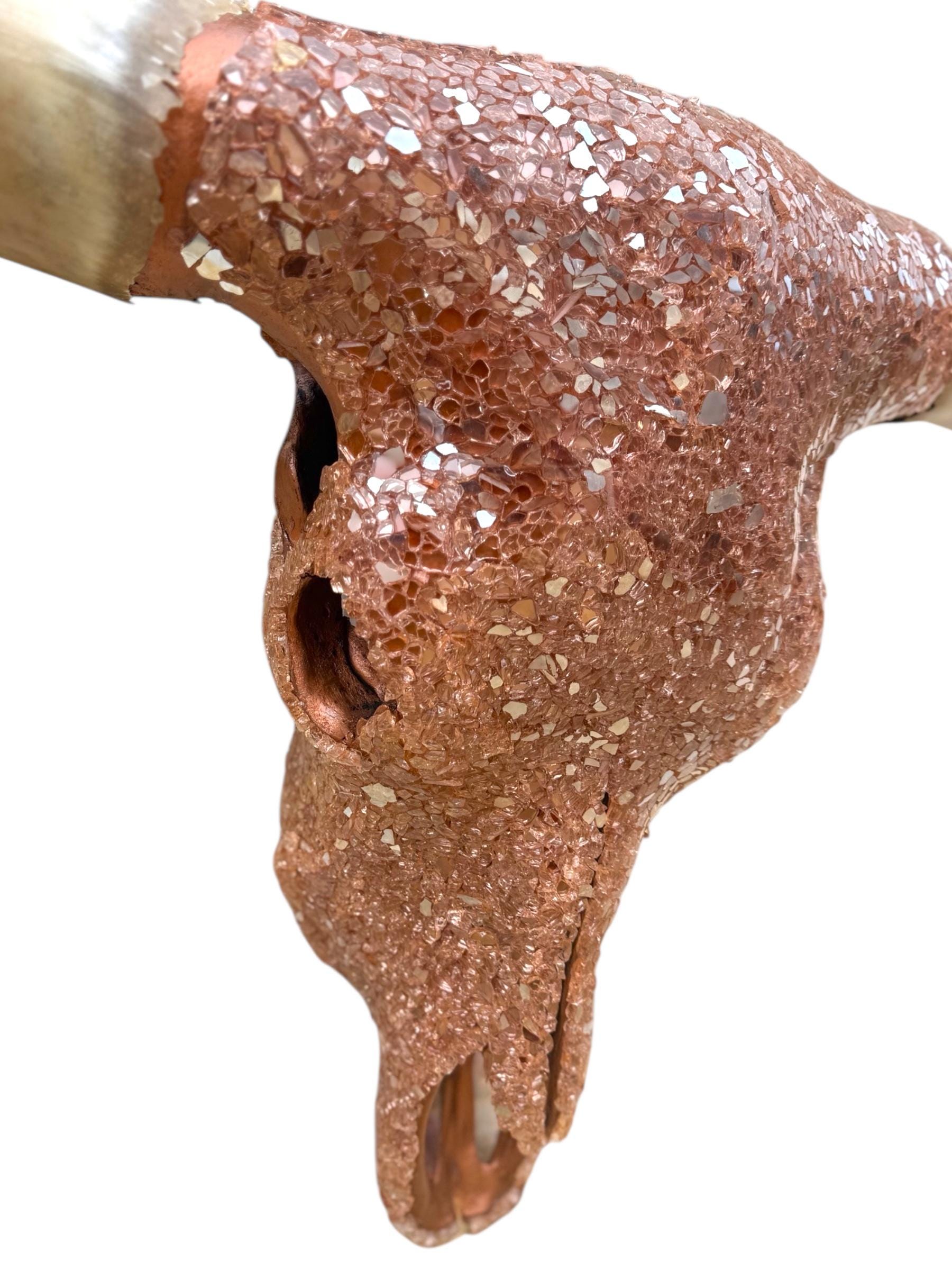 The skull has been painstakingly hand-finished with layers of crushed, reflective glass—set deep and intentional. No symmetry tricks. No factory polish. Every shard catches light differently, creating a living surface that shifts from metallic copper fire to soft champagne depending on the hour and the angle. In daylight, it glows. At night, it smolders.