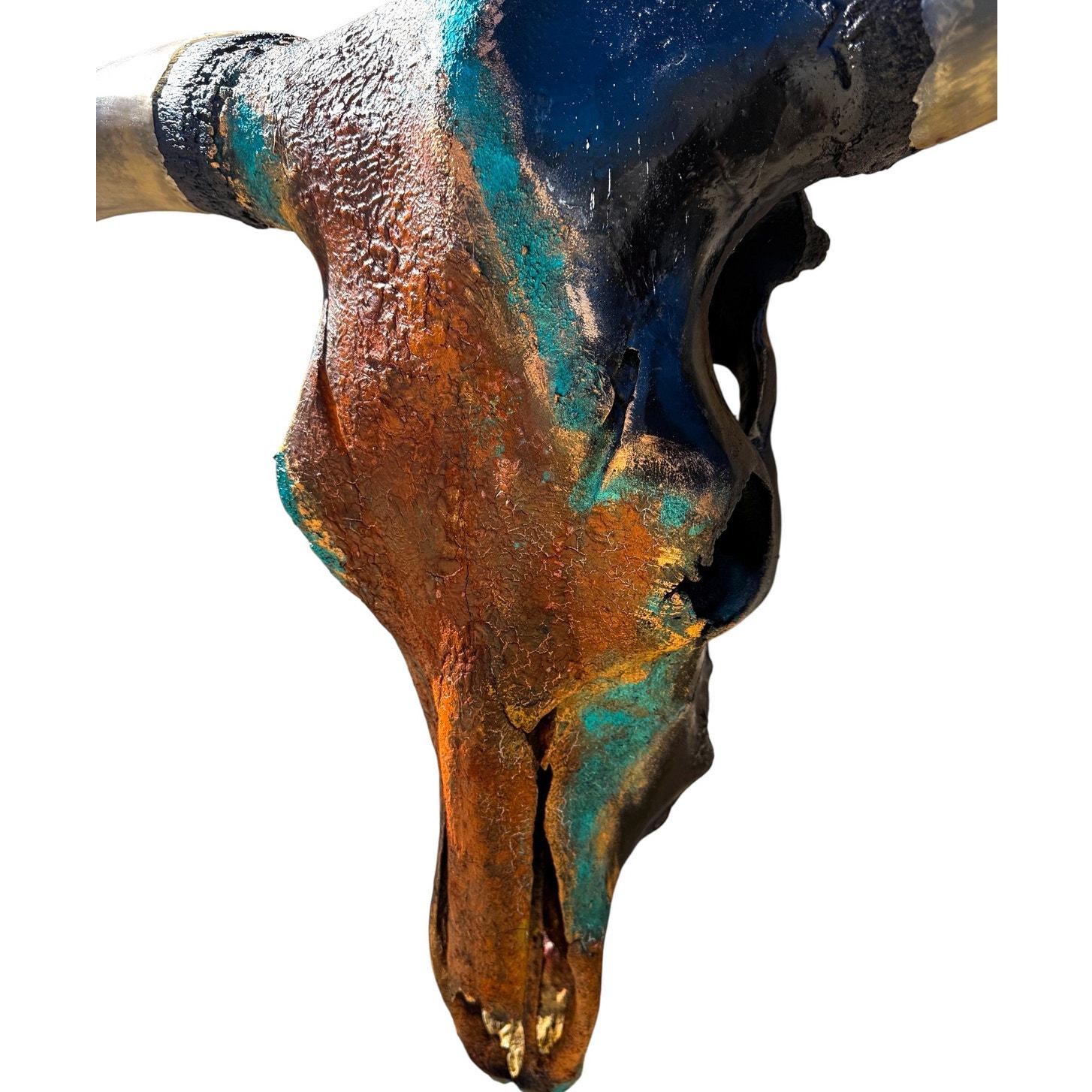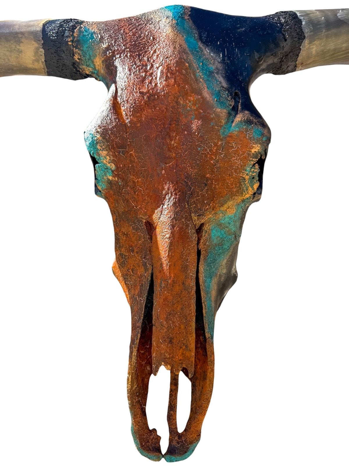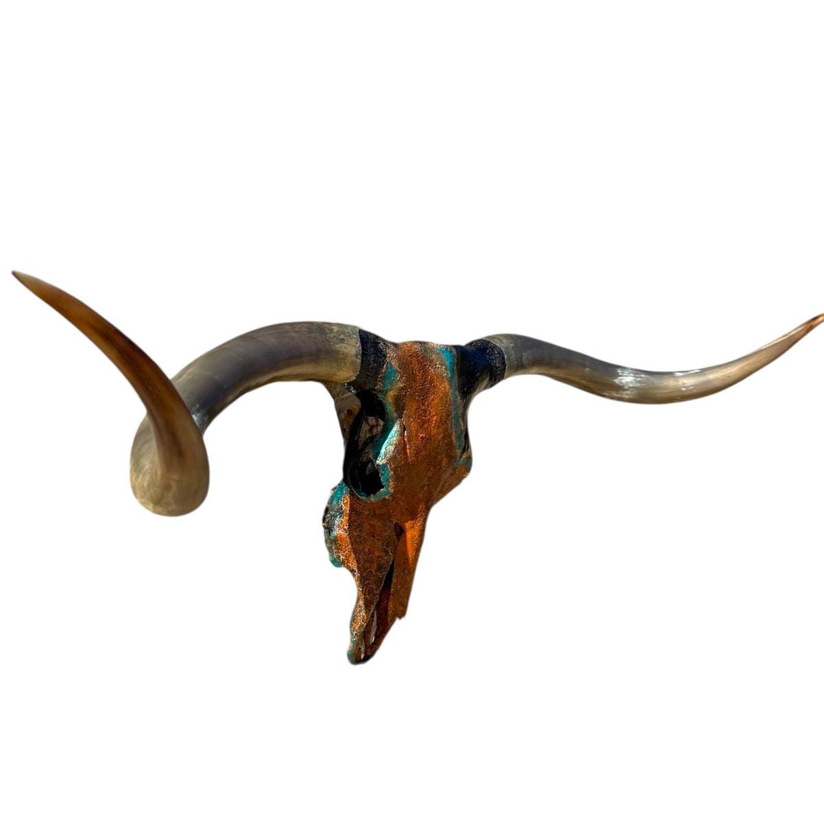 Forged by heat, time, and raw elemental force, Khaleesi is not décor. She’s a declaration. This longhorn cow walked her own terrain with quiet dominance, and today her spirit lives on in bone, fire, and patina: scorched copper tones, deep obsidian shadows, and flashes of turquoise that feel like dragonfire frozen mid-breath.