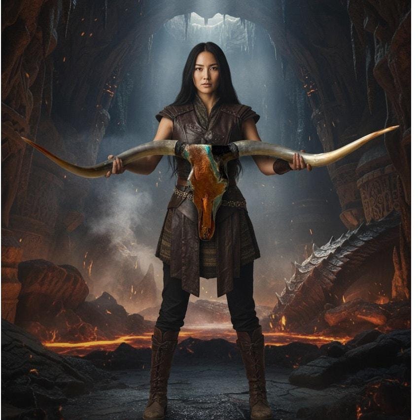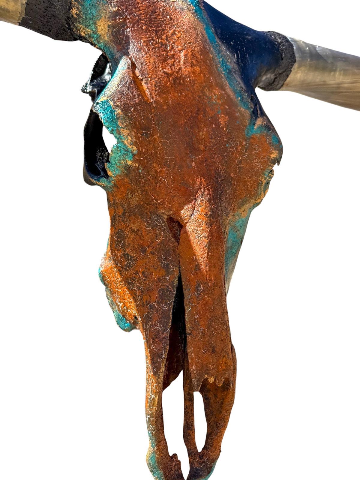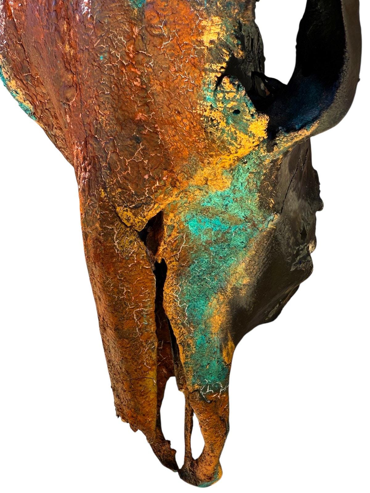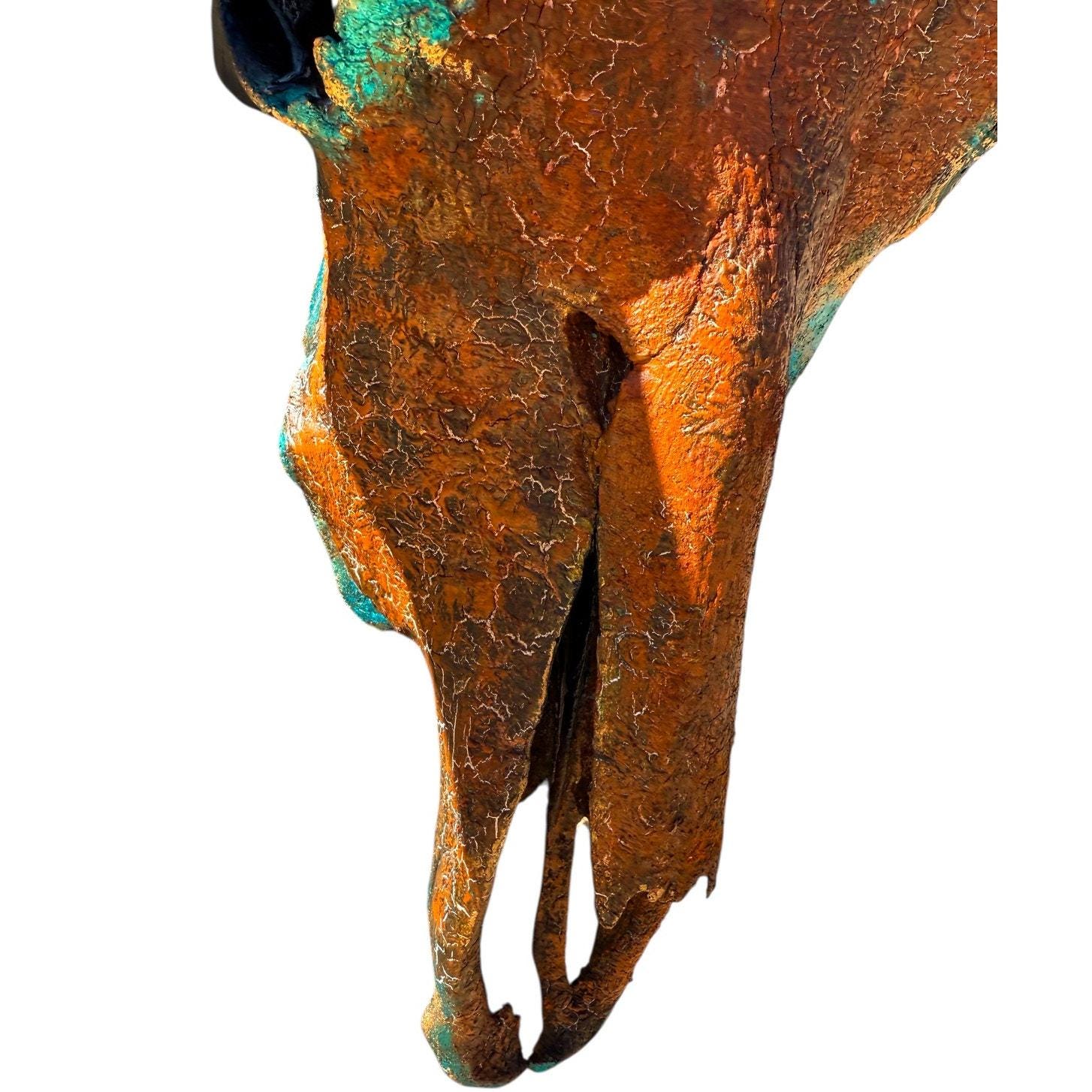 Forged by heat, time, and raw elemental force, Khaleesi is not décor. She’s a declaration. This longhorn cow walked her own terrain with quiet dominance, and today her spirit lives on in bone, fire, and patina: scorched copper tones, deep obsidian shadows, and flashes of turquoise that feel like dragonfire frozen mid-breath.