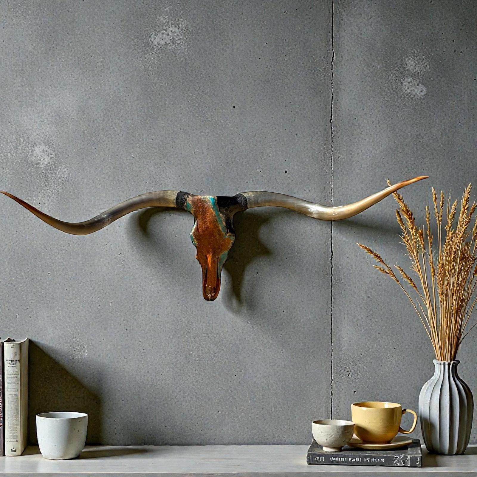 PLEASE NOTE: Our thoughtfully curated home decor backgrounds are designed to help you envision how a longhorn skull will elevate your space, offering inspiration for your walls. To make your decision effortless, we provide detailed videos and precise dimensions so you can see exactly how the piece will fit in your home. The total horn measurement is included so you can fully visualize the true size of a longhorn skull. Through our years of experience crafting longhorn skulls, we’ve found that some may appear shorter in width but look much larger due to the total curvature of the horns. This is why including the total horn measurement is so important.