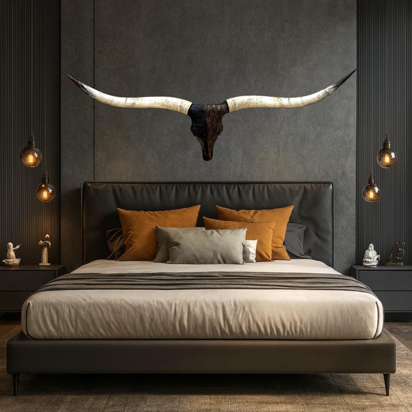 PLEASE NOTE: Our thoughtfully curated home decor backgrounds are designed to help you envision how a longhorn skull will elevate your space, offering inspiration for your walls. To make your decision effortless, we provide detailed videos and precise dimensions so you can see exactly how the piece will fit in your home. The total horn measurement is included so you can fully visualize the true size of a longhorn skull. Through our years of experience crafting longhorn skulls, we’ve found that some may appear shorter in width but look much larger due to the total curvature of the horns. This is why including the total horn measurement is so important.
