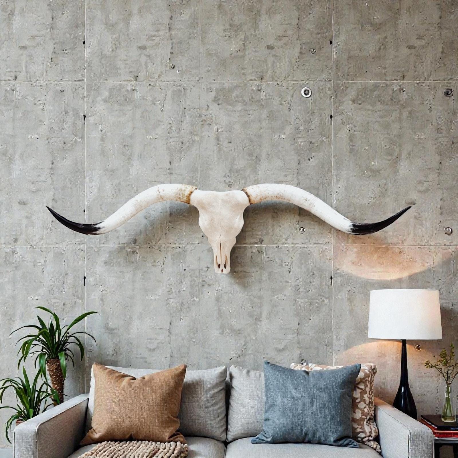 PLEASE NOTE: Our thoughtfully curated home decor backgrounds are designed to help you envision how a longhorn skull will elevate your space, offering inspiration for your walls. To make your decision effortless, we provide detailed videos and precise dimensions so you can see exactly how the piece will fit in your home. The total horn measurement is included so you can fully visualize the true size of a longhorn skull. Through our years of experience crafting longhorn skulls, we’ve found that some may appear shorter in width but look much larger due to the total curvature of the horns. This is why including the total horn measurement is so important.