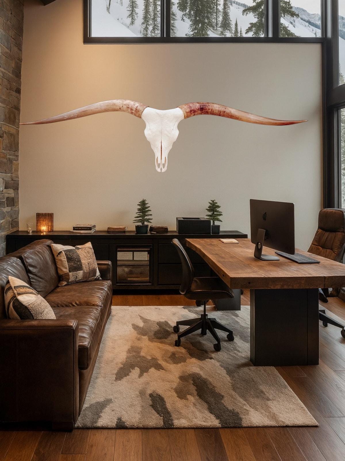 PLEASE NOTE: Our thoughtfully curated home decor backgrounds are designed to help you envision how a longhorn skull will elevate your space, offering inspiration for your walls. To make your decision effortless, we provide detailed videos and precise dimensions so you can see exactly how the piece will fit in your home. The total horn measurement is included so you can fully visualize the true size of a longhorn skull. Through our years of experience crafting longhorn skulls, we’ve found that some may appear shorter in width but look much larger due to the total curvature of the horns. This is why including the total horn measurement is so important.