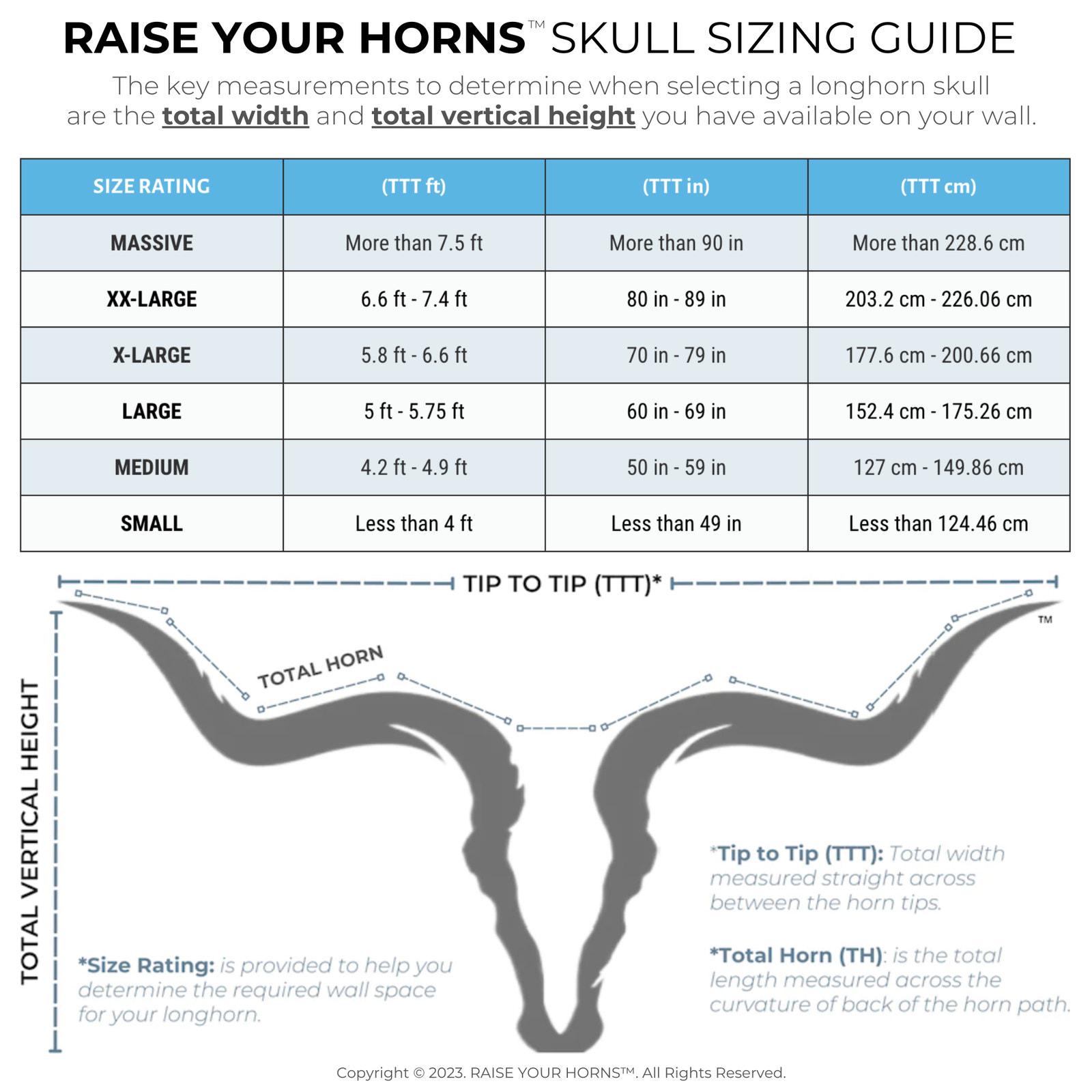 So if a listing says 8-ft TTT (and yes, we do get them this big), that's the total span (width) of the horns and a measurement to consider when sizing a longhorn skull for your space.