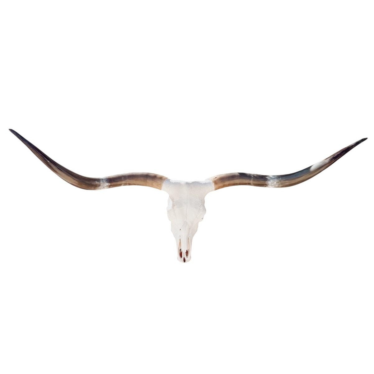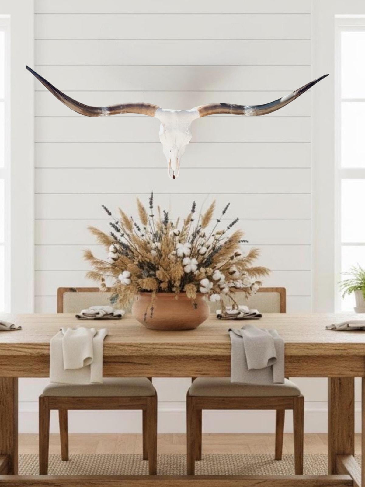 PLEASE NOTE: Our thoughtfully curated home decor backgrounds are designed to help you envision how a longhorn skull will elevate your space, offering inspiration for your walls. To make your decision effortless, we provide detailed videos and precise dimensions so you can see exactly how the piece will fit in your home. The total horn measurement is included so you can fully visualize the true size of a longhorn skull. Through our years of experience crafting longhorn skulls, we’ve found that some may appear shorter in width but look much larger due to the total curvature of the horns. This is why including the total horn measurement is so important.