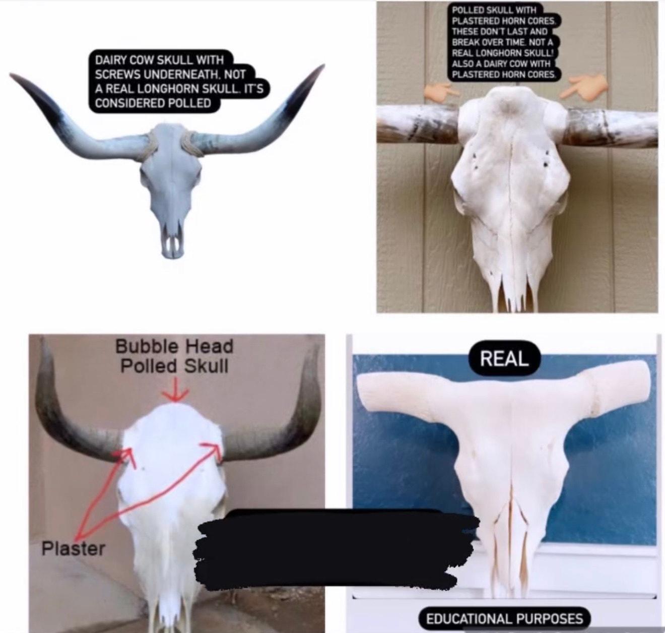 These are dairy cow skulls fitted with molded longhorn cores, designed to deceive buyers into thinking they are genuine longhorns. The attached ox horns often break over time. You can usually spot these fakes because the skull's structure appears unnatural or strange. A real longhorn skull has natural horn cores and doesn’t require any bondo or artificial work like dairy cow skulls who was not born with horns.