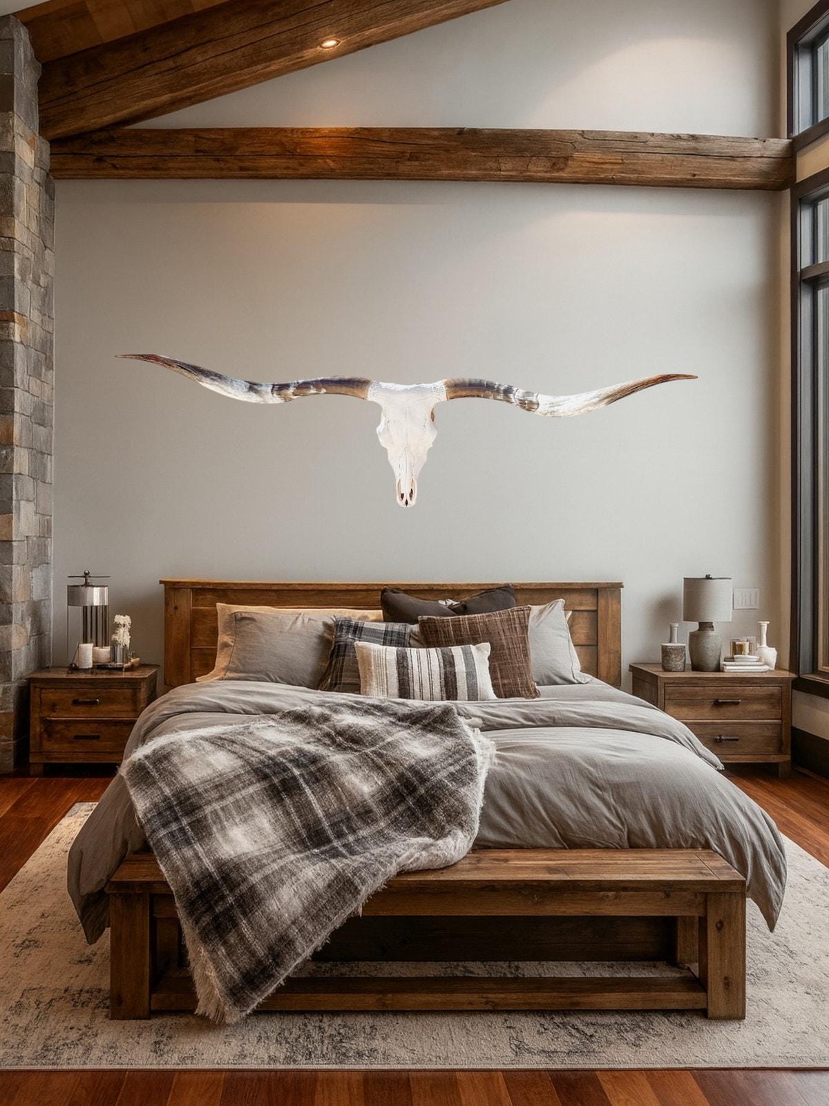 PLEASE NOTE: Our thoughtfully curated home decor backgrounds are designed to help you envision how a longhorn skull will elevate your space, offering inspiration for your walls. To make your decision effortless, we provide detailed videos and precise dimensions so you can see exactly how the piece will fit in your home. The total horn measurement is included so you can fully visualize the true size of a longhorn skull. Through our years of experience crafting longhorn skulls, we’ve found that some may appear shorter in width but look much larger due to the total curvature of the horns. This is why including the total horn measurement is so important.