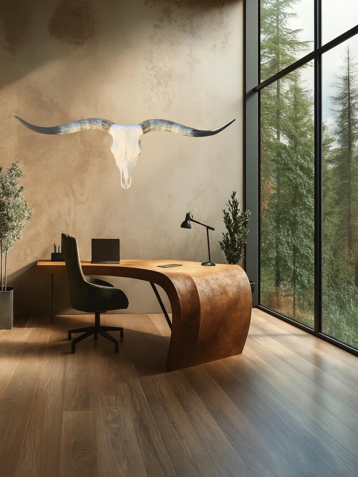 PLEASE NOTE: Our thoughtfully curated home decor backgrounds are designed to help you envision how a longhorn skull will elevate your space, offering inspiration for your walls. To make your decision effortless, we provide detailed videos and precise dimensions so you can see exactly how the piece will fit in your home. The total horn measurement is included so you can fully visualize the true size of a longhorn skull. Through our years of experience crafting longhorn skulls, we’ve found that some may appear shorter in width but look much larger due to the total curvature of the horns. This is why including the total horn measurement is so important.