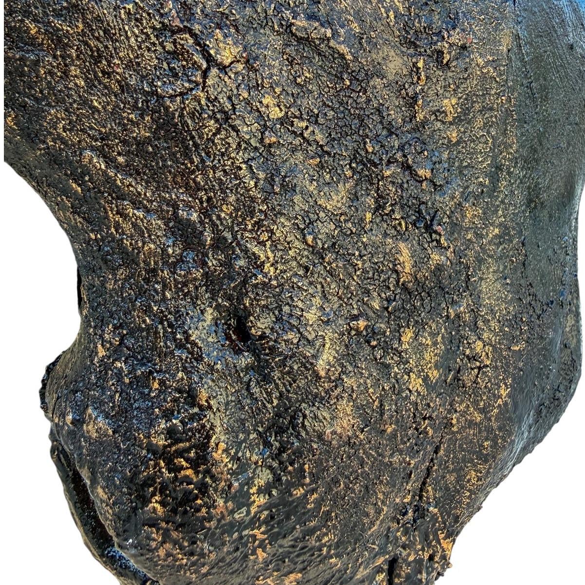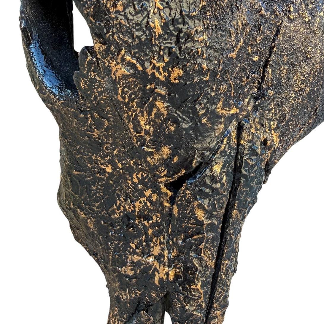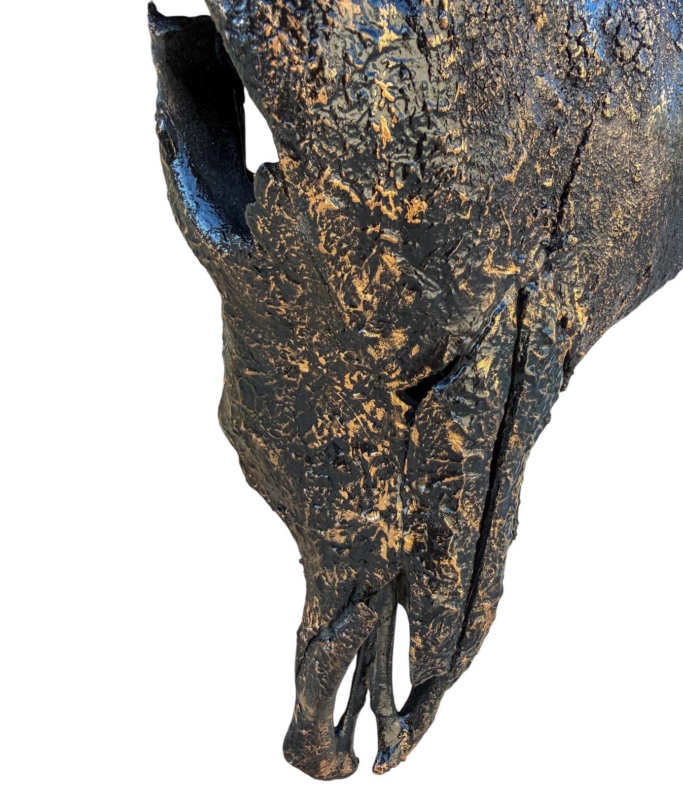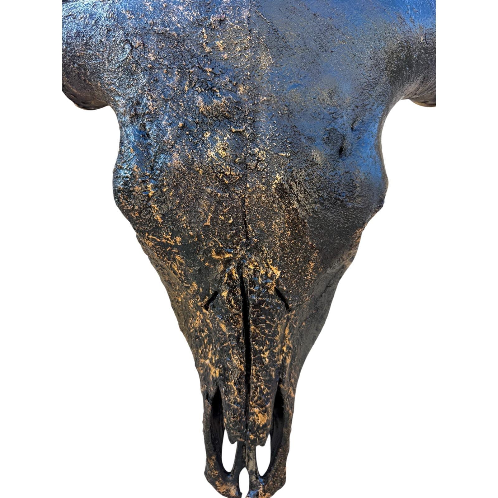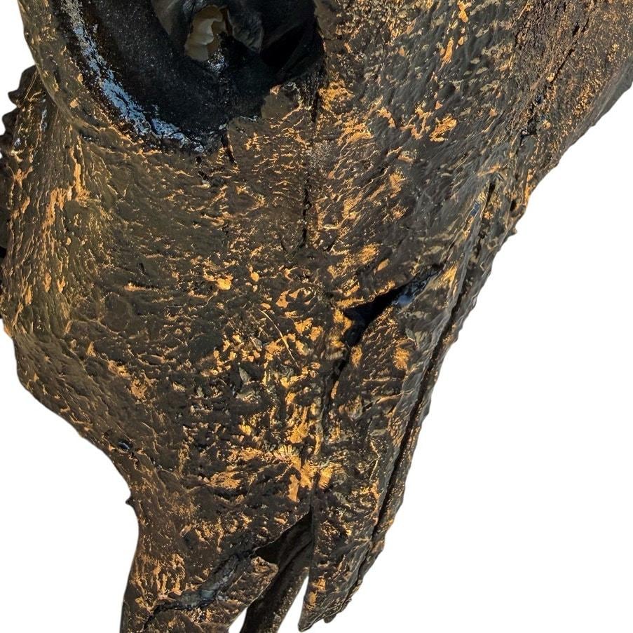 Remington is a real Texas Longhorn skull finished in deep black with hand-applied gold highlights that bring out the natural texture of the bone. The gold settles into the ridges and imperfections across the skull, giving the piece depth without covering its natural character.