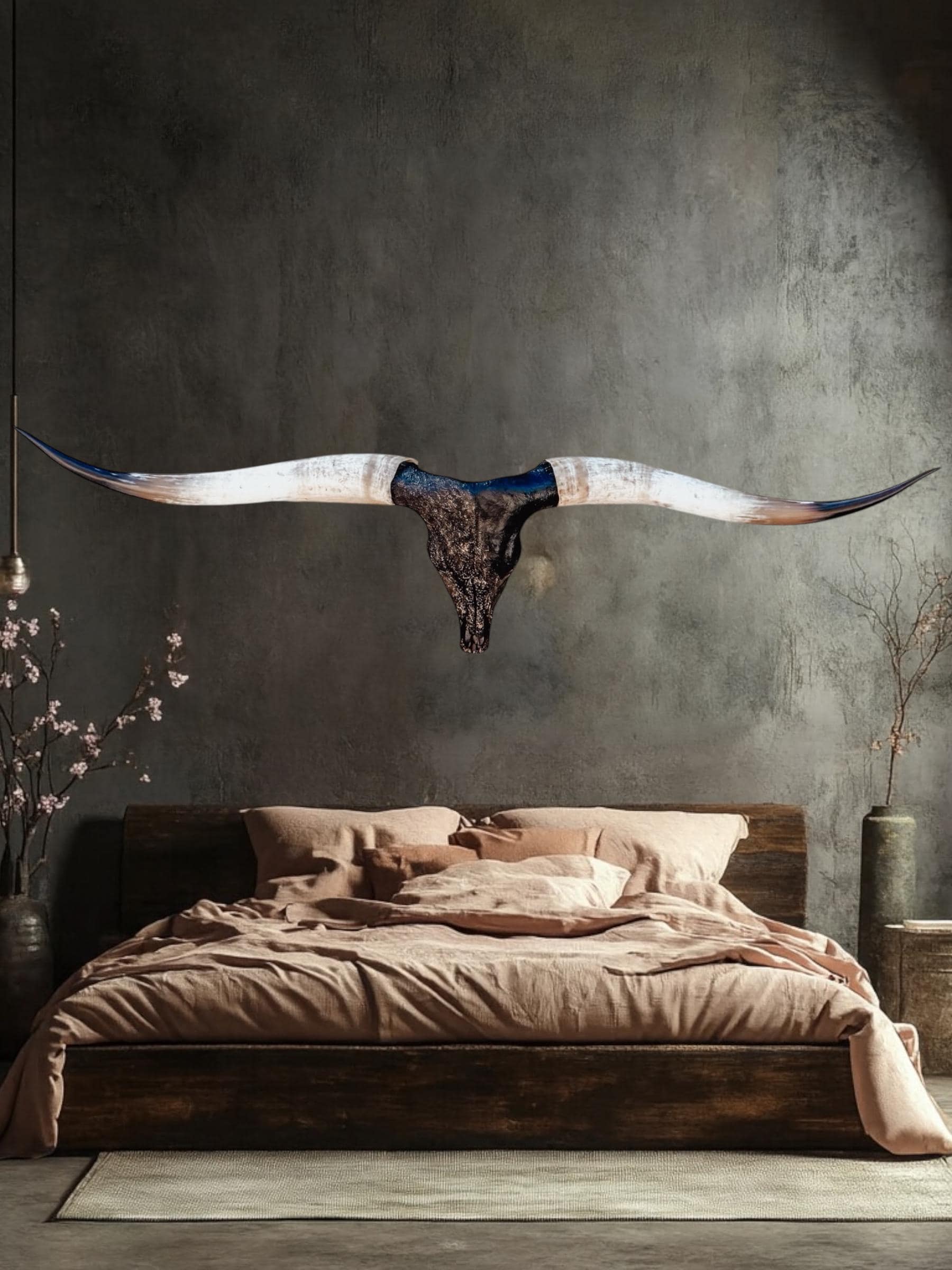PLEASE NOTE: Our thoughtfully curated home decor backgrounds are designed to help you envision how a longhorn skull will elevate your space, offering inspiration for your walls. To make your decision effortless, we provide detailed videos and precise dimensions so you can see exactly how the piece will fit in your home. The total horn measurement is included so you can fully visualize the true size of a longhorn skull. Through our years of experience crafting longhorn skulls, we’ve found that some may appear shorter in width but look much larger due to the total curvature of the horns. This is why including the total horn measurement is so important.