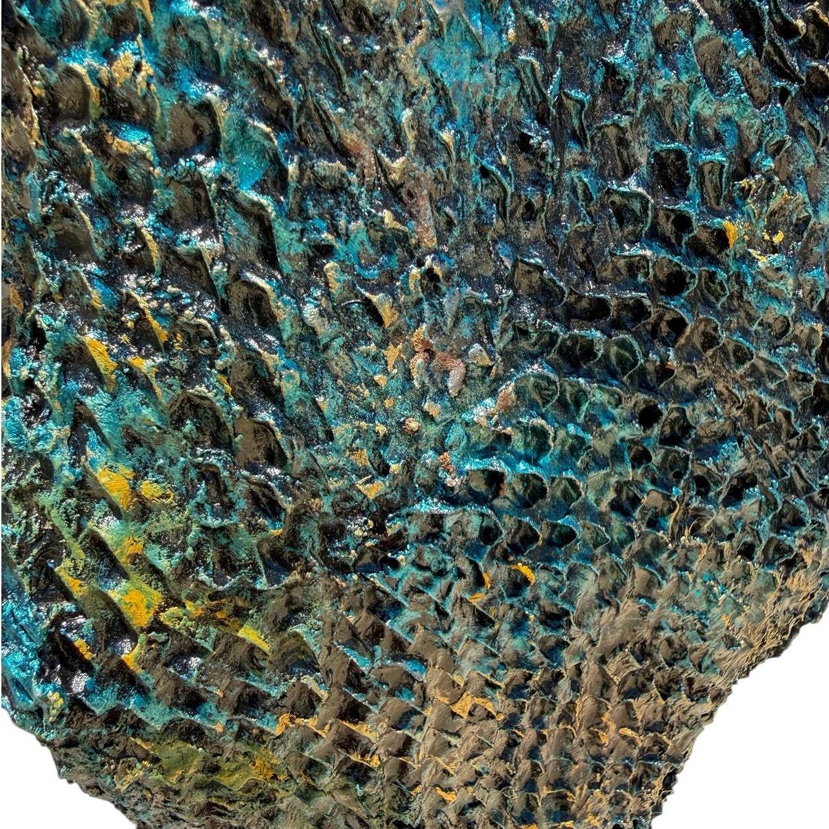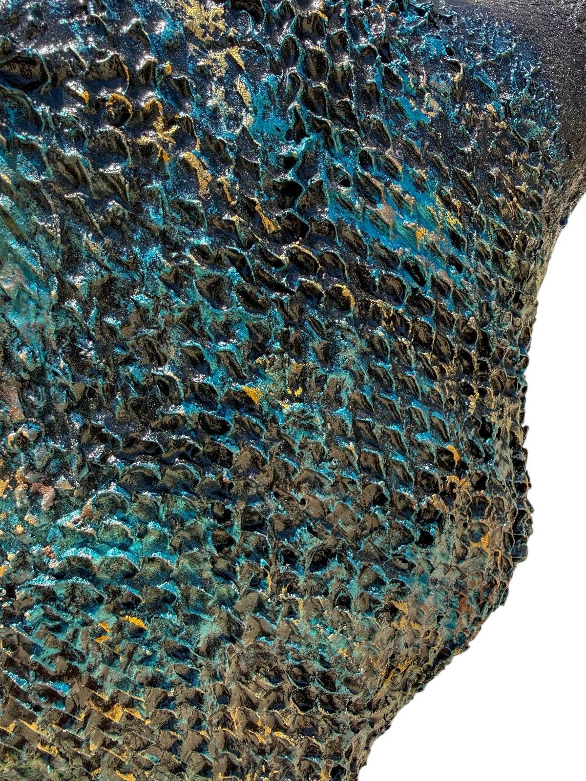 That raw absence pulls your eye in, while the deep, oceanic blues and fractured gold textures ripple across the surface like something pulled from another world—almost frozen in time, like fire turned to ice.
