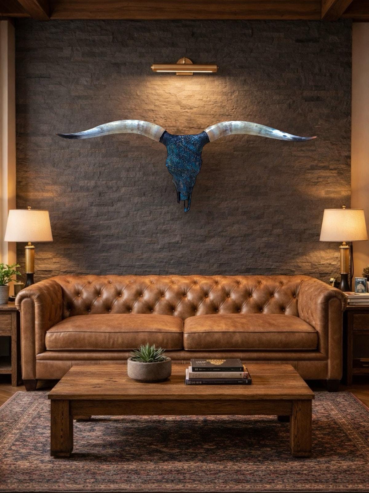 PLEASE NOTE: Our thoughtfully curated home decor backgrounds are designed to help you envision how a longhorn skull will elevate your space, offering inspiration for your walls. To make your decision effortless, we provide detailed videos and precise dimensions so you can see exactly how the piece will fit in your home. The total horn measurement is included so you can fully visualize the true size of a longhorn skull. Through our years of experience crafting longhorn skulls, we’ve found that some may appear shorter in width but look much larger due to the total curvature of the horns. This is why including the total horn measurement is so important.